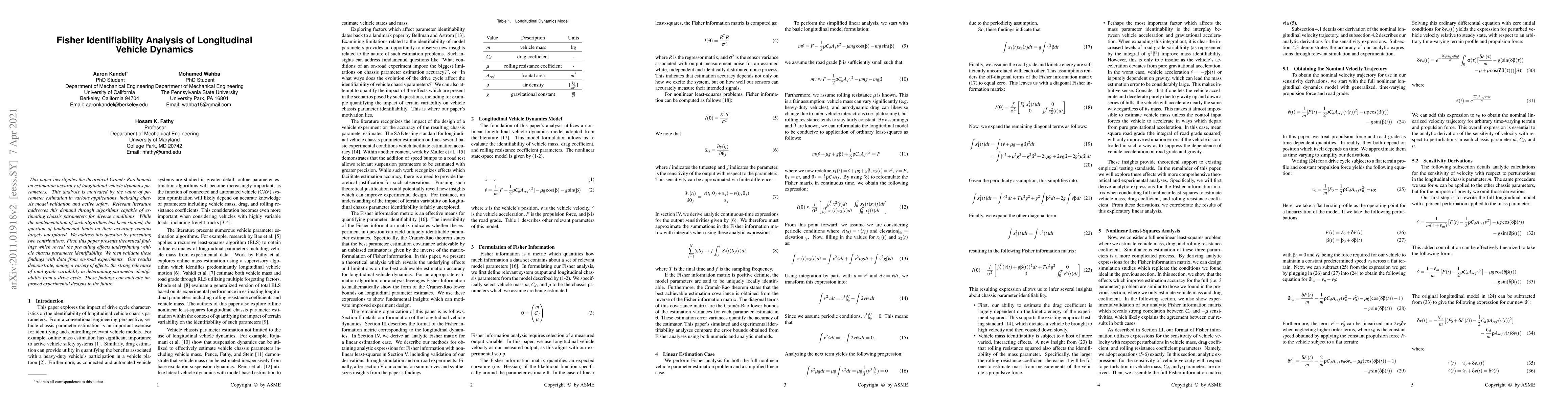 This paper explores the Cramer-Rao bounds on estimating longitudinal vehicle dynamics parameters, revealing fundamental limits on accuracy and identifying road grade variability as a key factor in parameter identifiability, validated through on-road experiments.