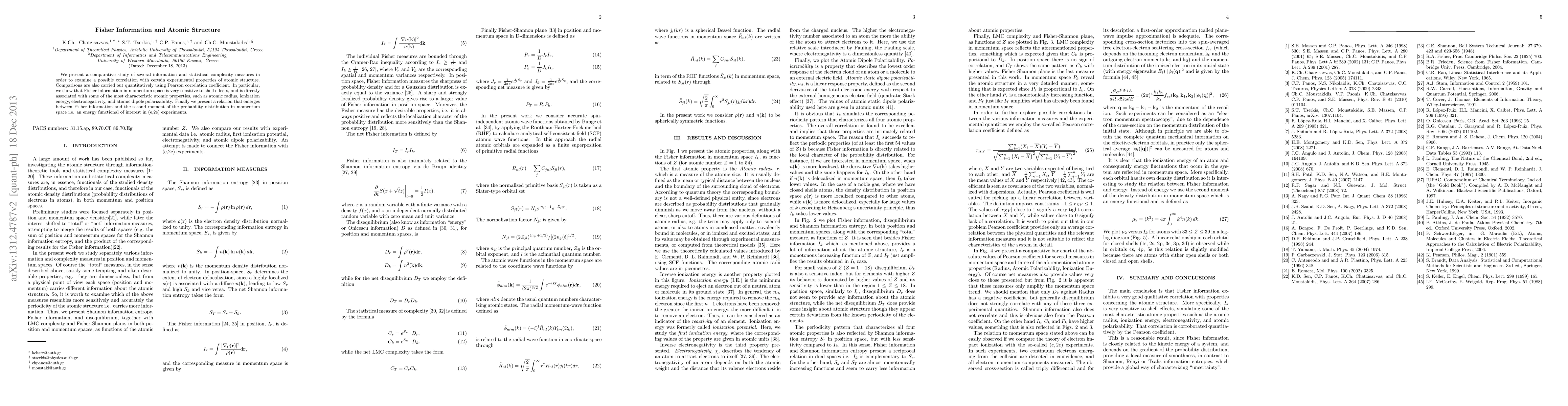 We present a comparative study of several information and statistical complexity measures in order to examine a possible correlation with certain experimental properties of atomic structure. Comparisons are also carried out quantitatively using Pearson correlation coefficient. In particular, we show that Fisher information in momentum space is very sensitive to shell effects, and is directly associated with some of the most characteristic atomic properties, such as atomic radius, ionization energy, electronegativity, and atomic dipole polarizability. Finally we present a relation that emerges between Fisher information and the second moment of the probability distribution in momentum space i.e. an energy functional of interest in (e,2e) experiments.