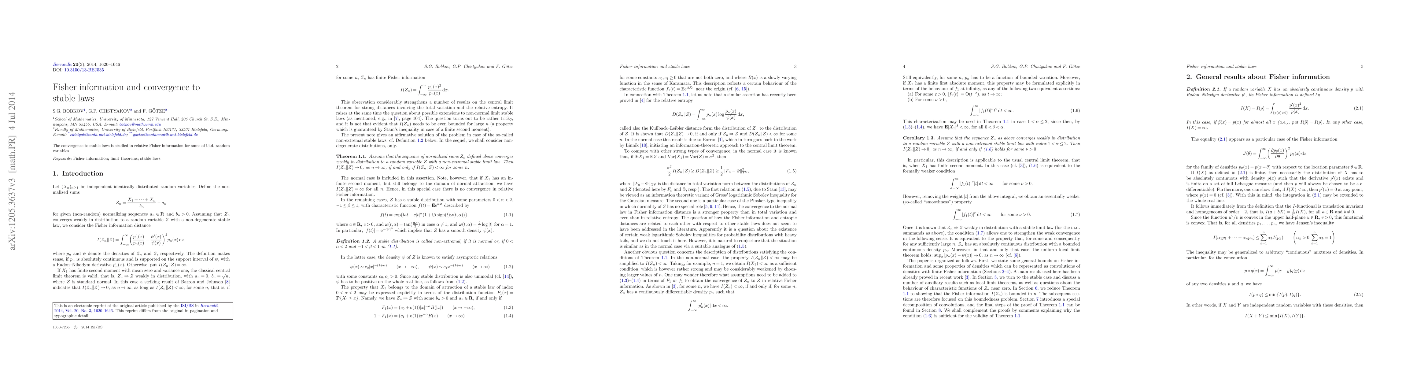 This paper studies the convergence to stable laws in relative Fisher information for sums of independent and identically distributed (i.i.d.) random variables, focusing on key findings about their behavior.