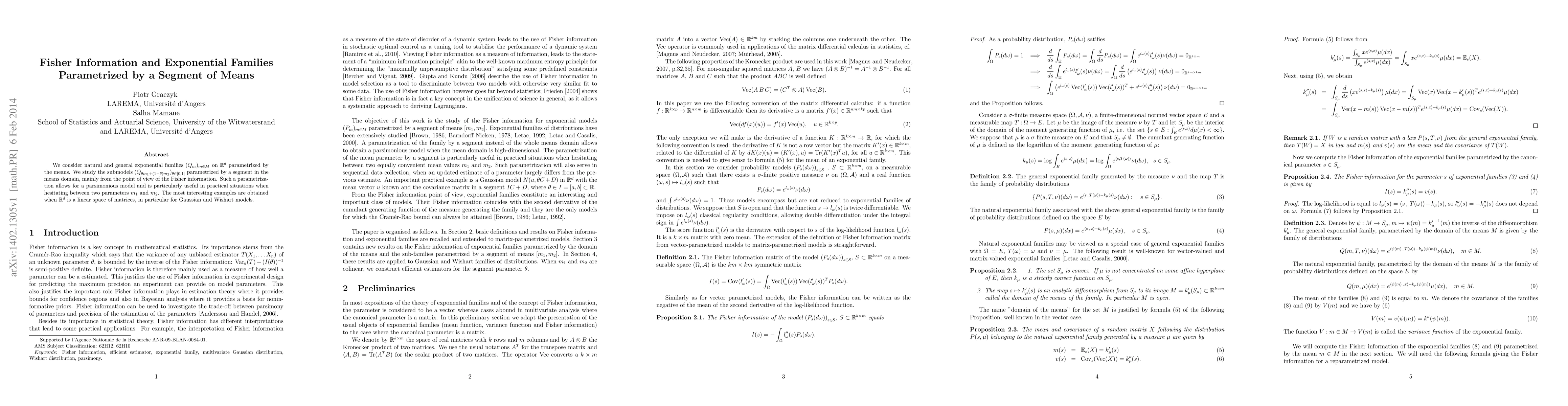 We consider natural and general exponential families $(Q_m)_{m\in M}$ on $\mathbb{R}^d$ parametrized by the means. We study the submodels $(Q_{\theta m_1+(1-\theta)m_2})_{\theta\in[0,1]}$ parametrized by a segment in the means domain, mainly from the point of view of the Fisher information. Such a parametrization allows for a parsimonious model and is particularly useful in practical situations when hesitating between two parameters $m_1$ and $m_2$. The most interesting examples are obtained when $\mathbb{R}^d$ is a linear space of matrices, in particular for Gaussian and Wishart models.