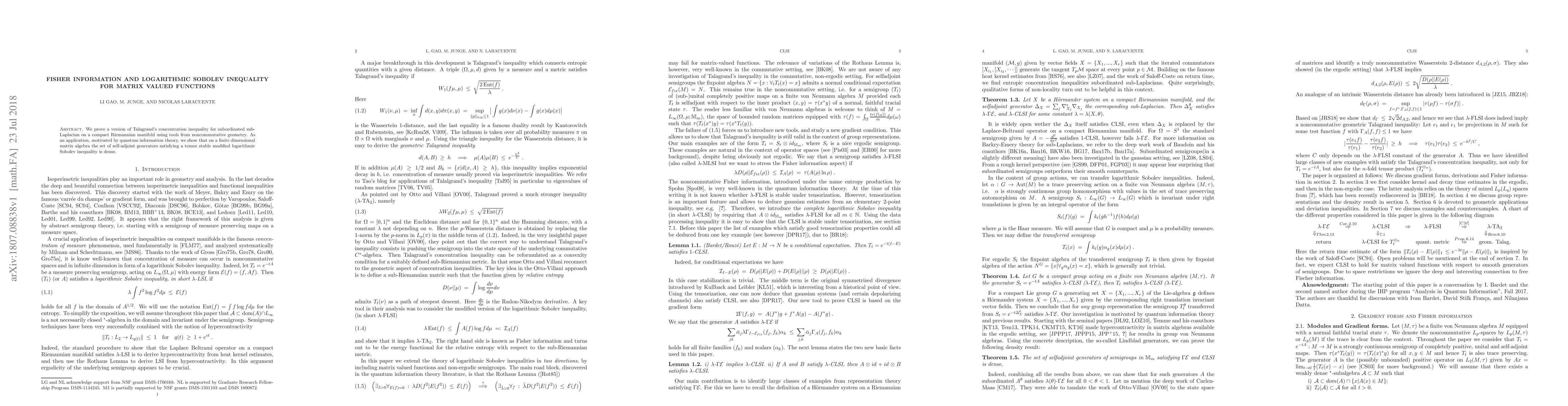 This paper proves a concentration inequality for a subordinated sub-Laplacian on a compact Riemannian manifold using noncommutative geometry. It also demonstrates that self-adjoint generators satisfying a tensor stable logarithmic Sobolev inequality are dense in finite-dimensional matrix algebras, inspired by quantum information theory.