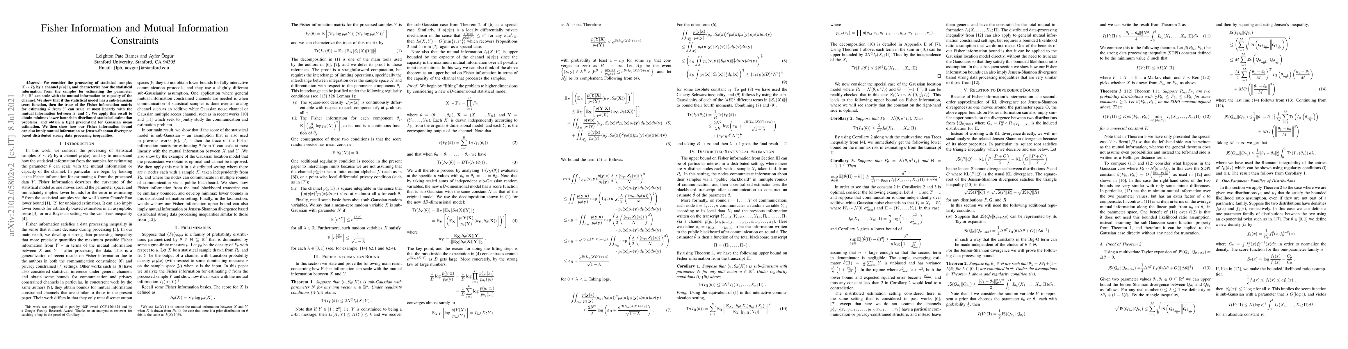 This paper investigates the relationship between statistical information from samples and channel capacity, demonstrating that the Fisher information matrix scales linearly with mutual information under sub-Gaussian score functions. It applies these findings to derive minimax lower bounds for distributed statistical estimation and establishes a tight preconstant for Gaussian mean estimation.