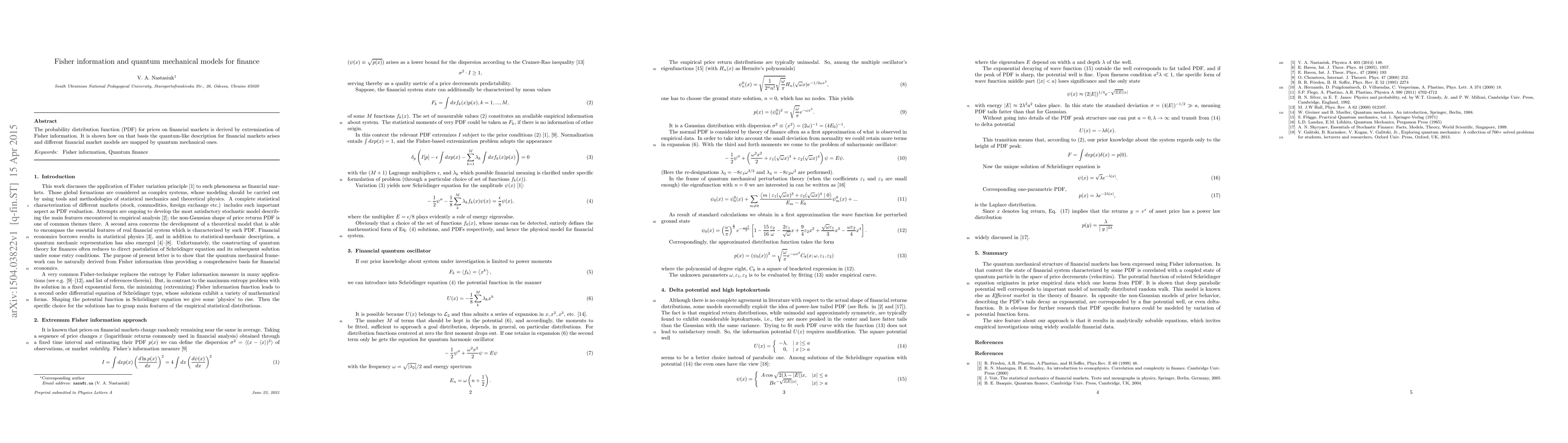 A research paper derives a probability distribution function for financial market prices through extremization of Fisher information, revealing a quantum-like description for financial markets.