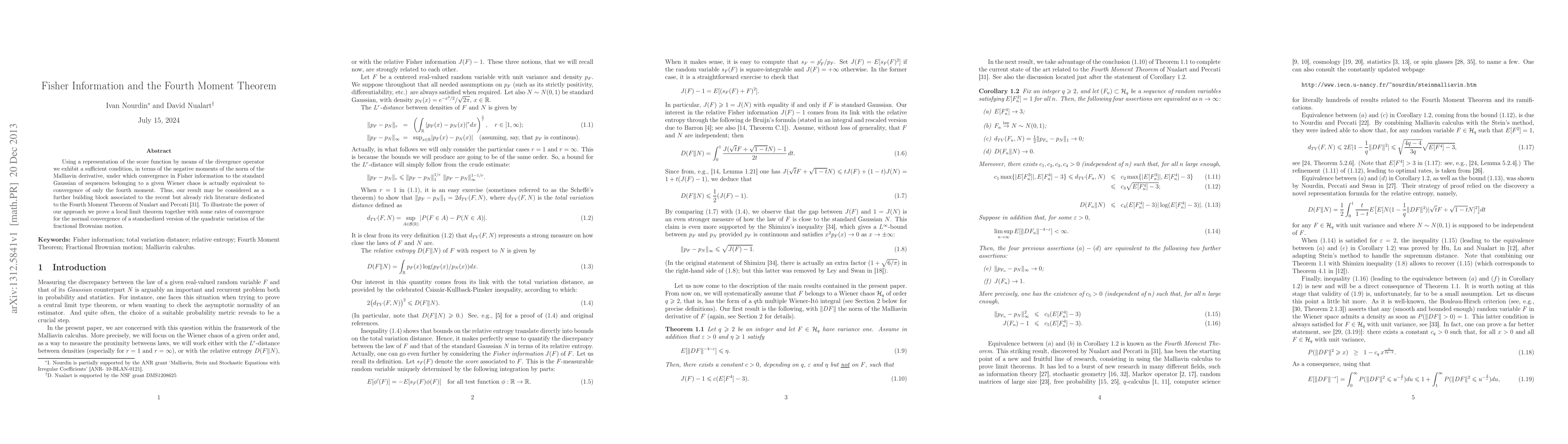 Using a representation of the score function by means of the divergence operator we exhibit a sufficient condition, in terms of the negative moments of the norm of the Malliavin derivative, under which convergence in Fisher information to the standard Gaussian of sequences belonging to a given Wiener chaos is actually equivalent to convergence of only the fourth moment. Thus, our result may be considered as a further building block associated to the recent but already rich literature dedicated to the Fourth Moment Theorem of Nualart and Peccati. To illustrate the power of our approach we prove a local limit theorem together with some rates of convergence for the normal convergence of a standardized version of the quadratic variation of the fractional Brownian motion.