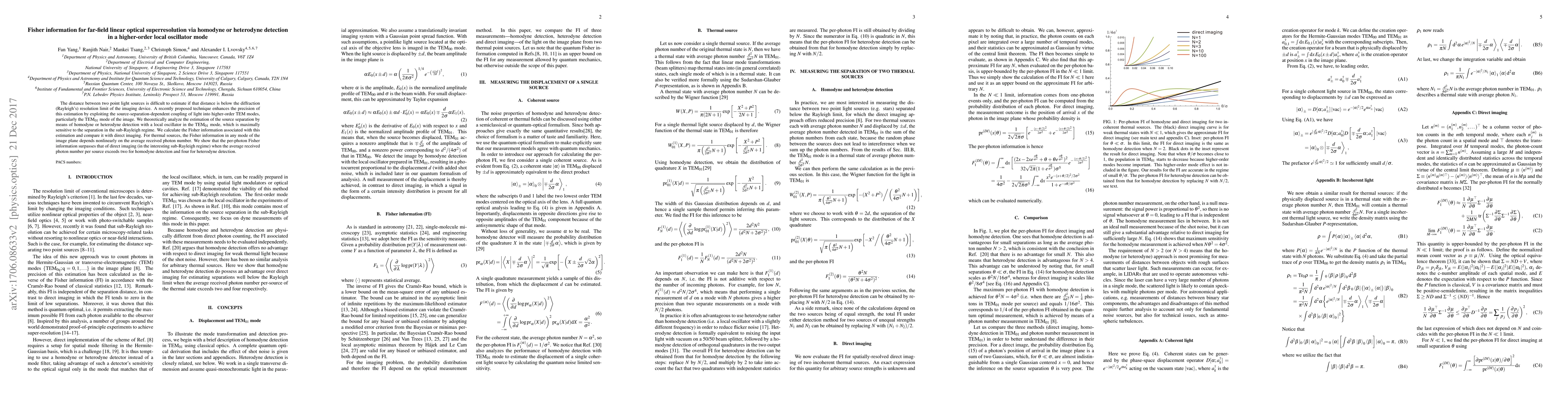 The distance between two point light sources is difficult to estimate if that distance is below the diffraction (Rayleigh's) resolution limit of the imaging device. A recently proposed technique enhances the precision of this estimation by exploiting the source-separation-dependent coupling of light into higher-order $\rm{TEM}$ modes, particularly the $\rm{TEM}_{01}$ mode of the image. We theoretically analyze the estimation of the source separation by means of homodyne or heterodyne detection with a local oscillator in the $\rm{TEM}_{01}$ mode, which is maximally sensitive to the separation in the sub-Rayleigh regime. We calculate the per-photon Fisher information associated with this estimation and compare it with direct imaging. For thermal sources, the per-photon Fisher information depends on the average photon number per thermal mode of the image; it surpasses the Fisher information for direct imaging (in the interesting sub-Rayleigh regime) when the average photon number exceeds two for homodyne detection and four for heterodyne detection.