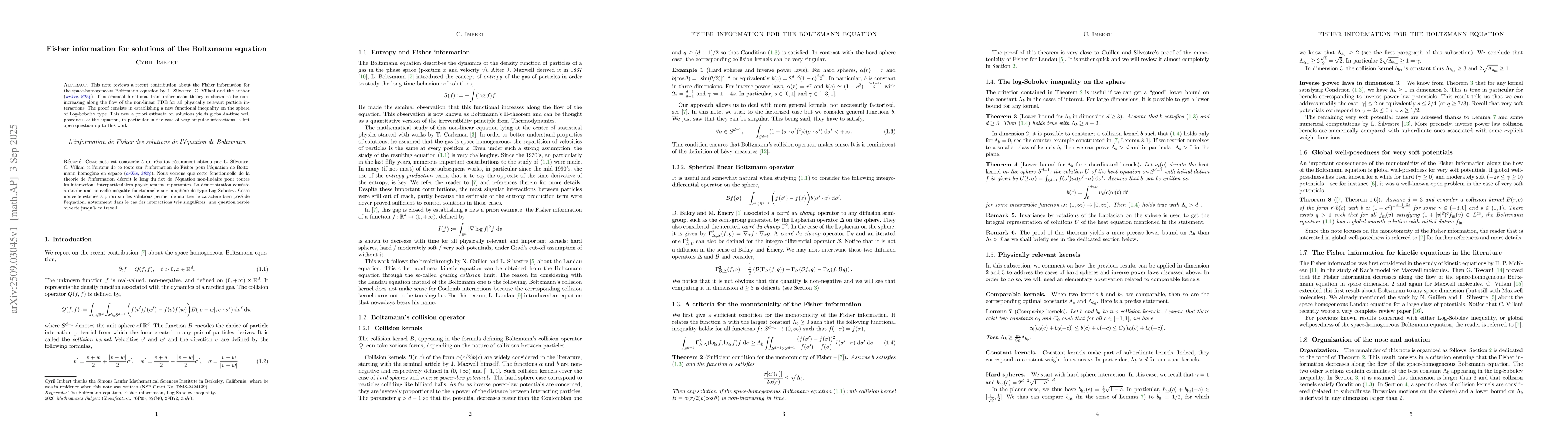 This note reviews a recent contribution about the Fisher information for the space-homogeneous Boltzmann equation by L. Silvestre, C. Villani and the author (arXiv, 2024). This classical functional from information theory is shown to be nonincreasing along the flow of the non-linear PDE for all physically relevant particle interactions. The proof consists in establishing a new functional inequality on the sphere of Log-Sobolev type. This new a priori estimate on solutions yields global-in-time well posedness of the equation, in particular in the case of very singular interactions, a left open question up to this work. L'information de Fisher des solutions de l'{\'e}quation de Boltzmann R{\'e}sum{\'e}.