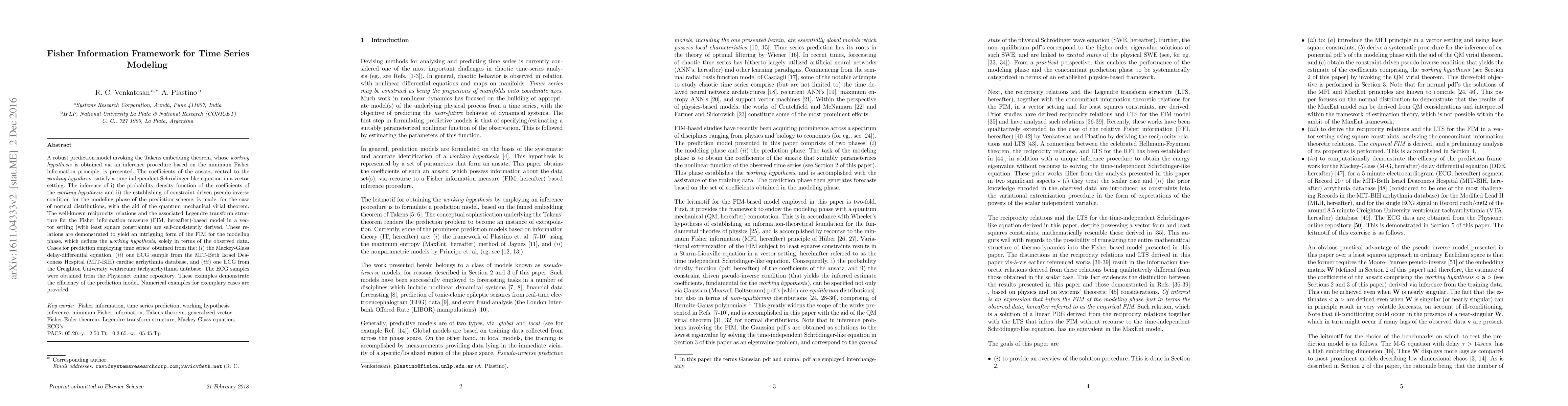 A robust prediction model invoking the Takens embedding theorem, whose \textit{working hypothesis} is obtained via an inference procedure based on the minimum Fisher information principle, is presented. The coefficients of the ansatz, central to the \textit{working hypothesis} satisfy a time independent Schr\"{o}dinger-like equation in a vector setting. The inference of i) the probability density function of the coefficients of the \textit{working hypothesis} and ii) the establishing of constraint driven pseudo-inverse condition for the modeling phase of the prediction scheme, is made, for the case of normal distributions, with the aid of the quantum mechanical virial theorem. The well-known reciprocity relations and the associated Legendre transform structure for the Fisher information measure (FIM, hereafter)-based model in a vector setting (with least square constraints) are self-consistently derived. These relations are demonstrated to yield an intriguing form of the FIM for the modeling phase, which defines the \textit{working hypothesis}, solely in terms of the observed data. Cases for prediction employing time series' obtained from the: $(i)$ the Mackey-Glass delay-differential equation, $(ii)$ one ECG sample from the MIT-Beth Israel Deaconess Hospital (MIT-BIH) cardiac arrhythmia database, and $(iii)$ one ECG from the Creighton University ventricular tachyarrhythmia database. The ECG samples were obtained from the Physionet online repository. These examples demonstrate the efficiency of the prediction model. Numerical examples for exemplary cases are provided.