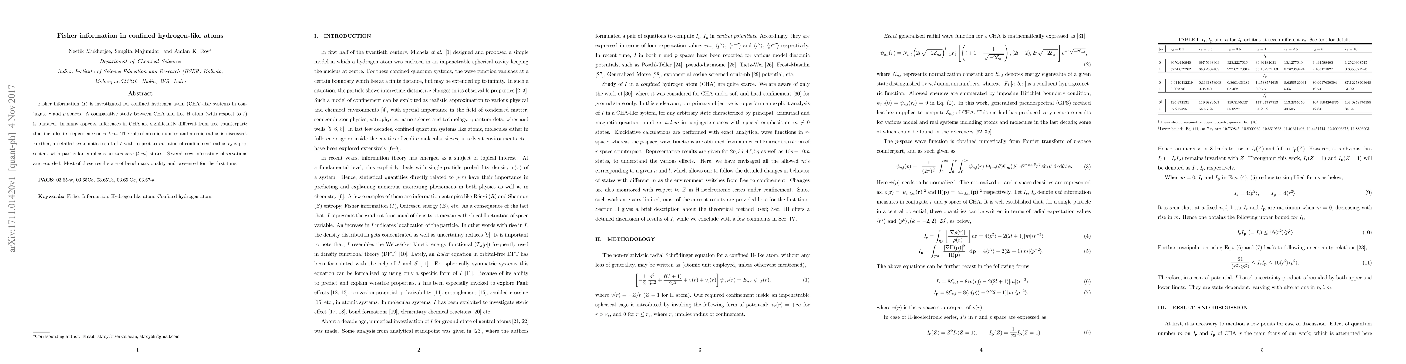 Fisher information (I) is investigated for confined hydrogen atom (CHA)-like systems in conjugate $r$ and $p$ spaces. A comparative study between CHA and free H atom (with respect to $I$) is pursued. In many aspects, inferences in CHA are significantly different from free counterpart; that includes its dependence on $n, l, m$. The role of atomic number and atomic radius is discussed. Further, a detailed systematic result of $I$ with respect to variation of confinement radius $r_c$ is presented, with particular emphasis on \emph{non-zero}-$(l,m)$ states. Several new interesting observations are recorded. Most of these results are of benchmark quality and presented for the first time.