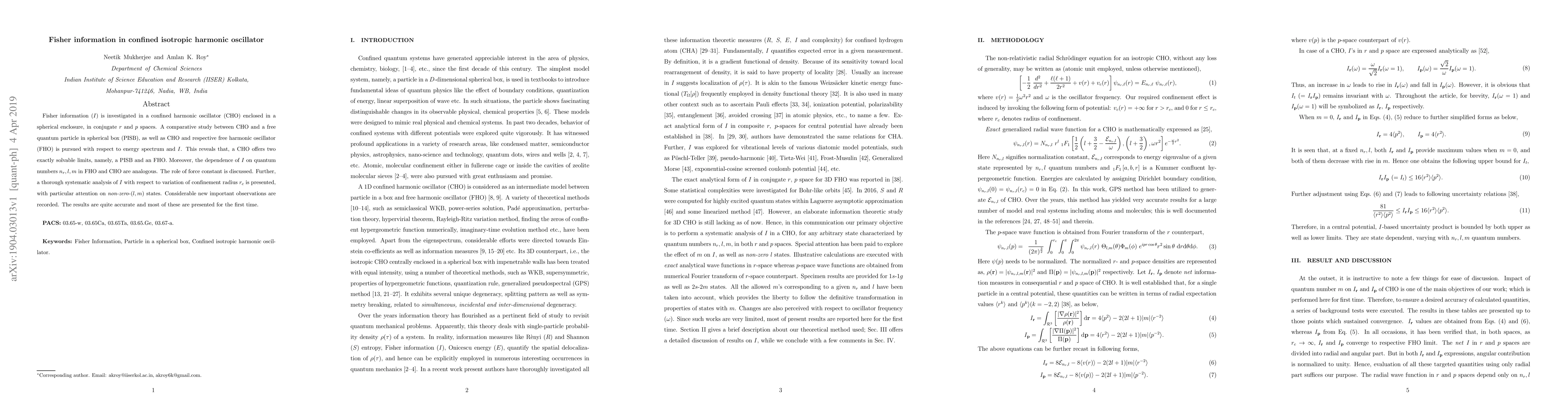 This paper investigates Fisher information in a confined isotropic harmonic oscillator (CHO) within a spherical enclosure, comparing it with a free quantum particle in a spherical box and a free harmonic oscillator. The study reveals analogous dependencies of Fisher information on quantum numbers and highlights new insights into the role of confinement radius and force constant.