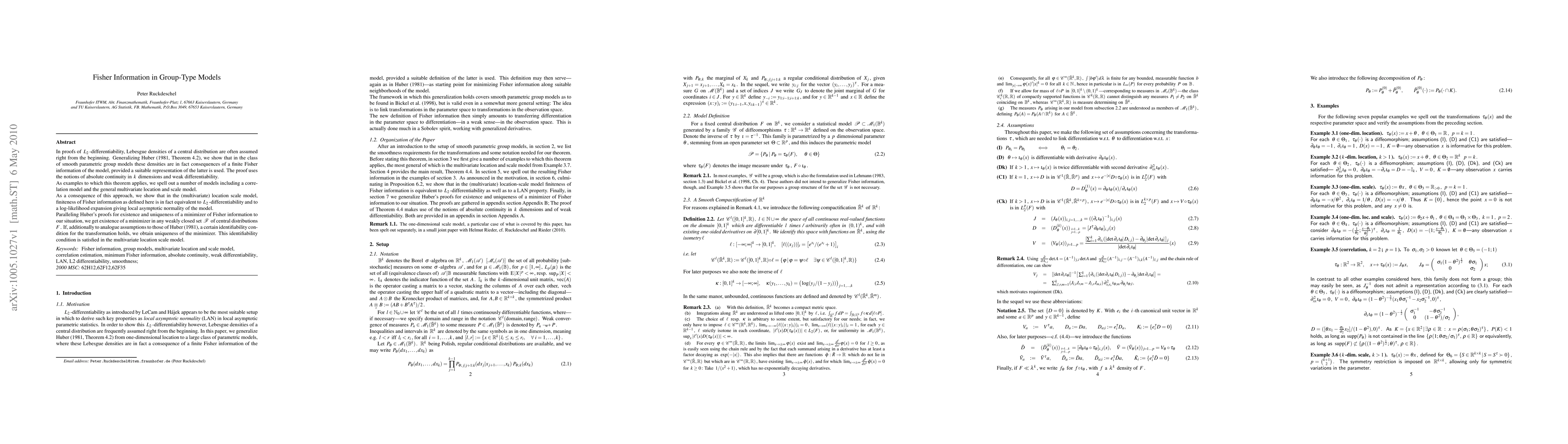 In proofs of L_2-differentiability, Lebesgue densities of a central distribution are often assumed right from the beginning. Generalizing Theorem 4.2 of Huber[81], we show that in the class of smooth parametric group models these densities are in fact consequences of a finite Fisher information of the model, provided a suitable representation of the latter is used. The proof uses the notions of absolute continuity in k dimensions and weak differentiability. As examples to which this theorem applies, we spell out a number of models including a correlation model and the general multivariate location and scale model. As a consequence of this approach, we show that in the (multivariate) location scale model, finiteness of Fisher information as defined here is in fact equivalent to L_2-differentiability and to a log-likelihood expansion giving local asymptotic normality of the model. Paralleling Huber's proofs for existence and uniqueness of a minimizer of Fisher information to our situation, we get existence of a minimizer in any weakly closed set of central distributions F. If, additionally to analogue assumptions to those of Huber[81], a certain identifiability condition for the transformation holds, we obtain uniqueness of the minimizer. This identifiability condition is satisfied in the multivariate location scale model.