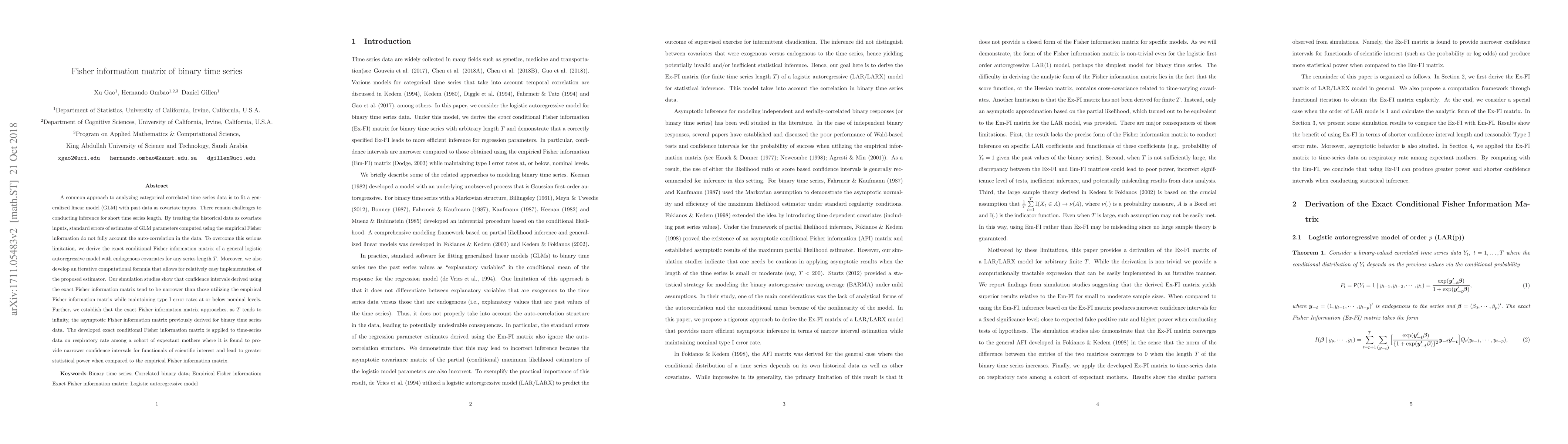 Researchers developed an exact conditional Fisher information matrix for binary time series data with auto-correlation, providing narrower confidence intervals and greater statistical power compared to empirical methods, especially at short series lengths.