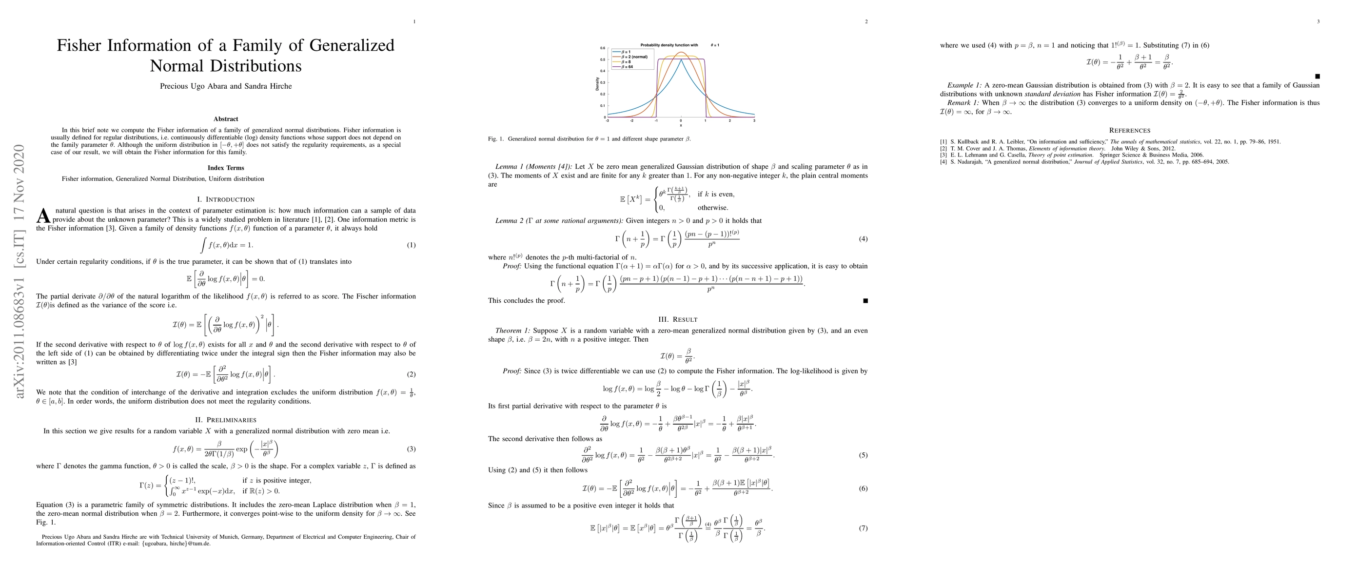 In this brief note we compute the Fisher information of a family of generalized normal distributions. Fisher information is usually defined for regular distributions, i.e. continuously differentiable (log) density functions whose support does not depend on the family parameter $\theta$. Although the uniform distribution in $[-\theta, + \theta]$ does not satisfy the regularity requirements, as a special case of our result, we will obtain the Fisher information for this family.