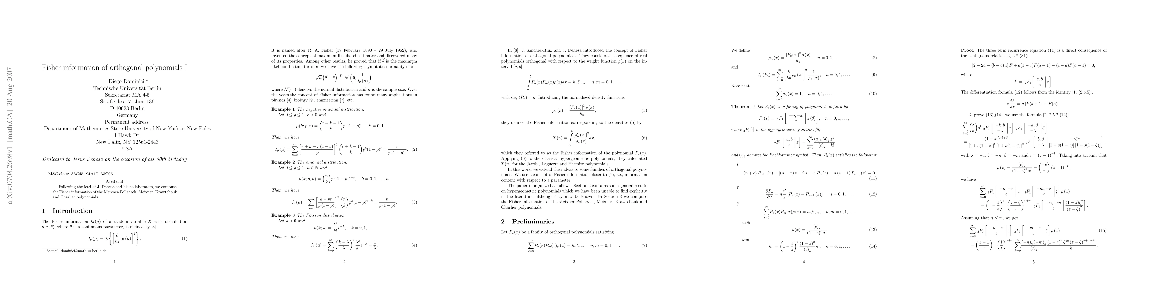 Following the lead of J. Dehesa and his collaborators, we compute the Fisher information of the Meixner-Pollaczek, Meixner, Krawtchouk and Charlier polynomials.