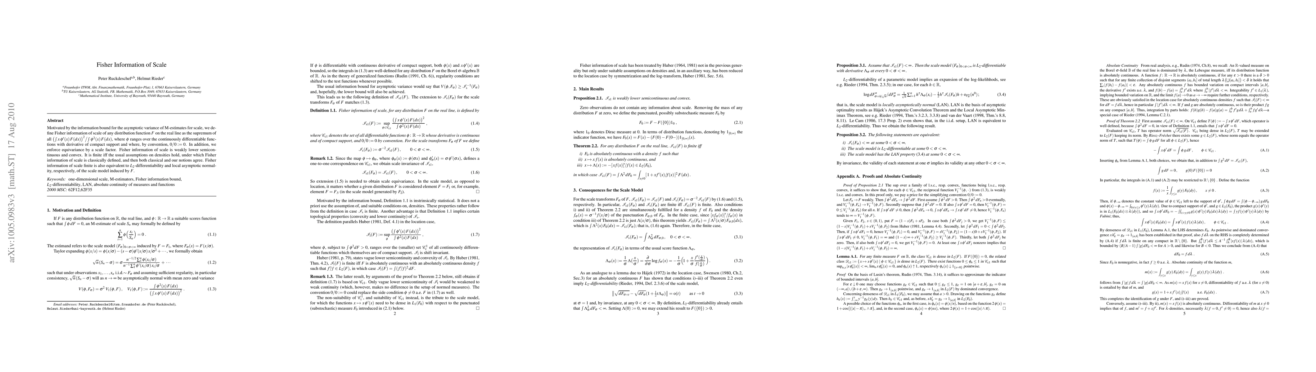 This paper defines Fisher information of scale for any distribution function F on the real line, establishing its properties of weak lower semicontinuity and convexity. It shows that the concept aligns with classical definitions when usual density assumptions hold, and finiteness of this information is linked to L_2-differentiability and local asymptotic normality of the scale model.