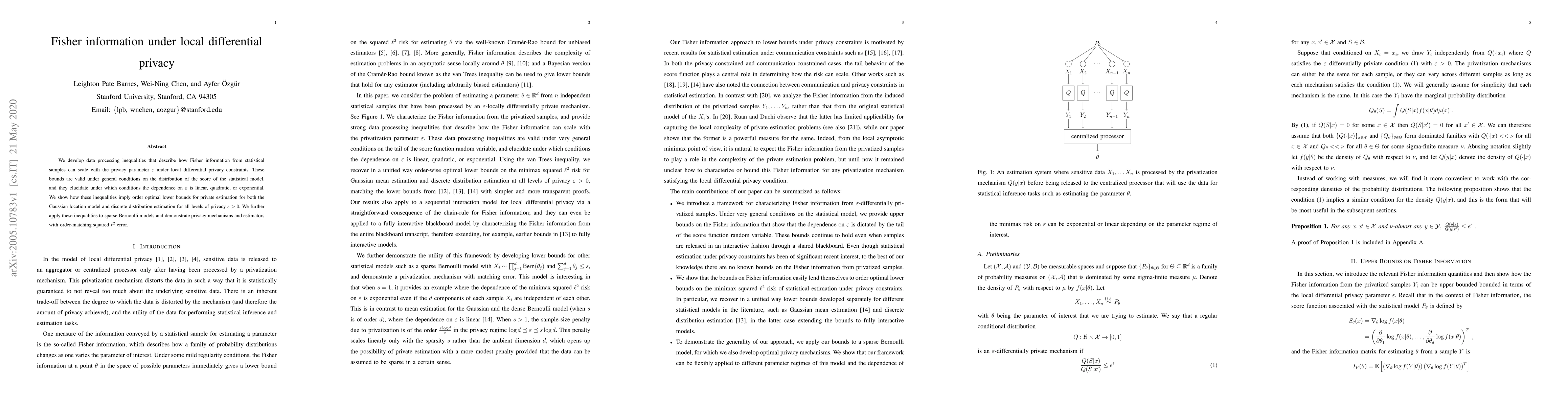 This paper develops data processing inequalities for Fisher information under local differential privacy, revealing the scaling behavior with the privacy parameter $\varepsilon$. It provides order-optimal lower bounds for private estimation in Gaussian and discrete distribution models, and demonstrates optimal privacy mechanisms for sparse Bernoulli models.