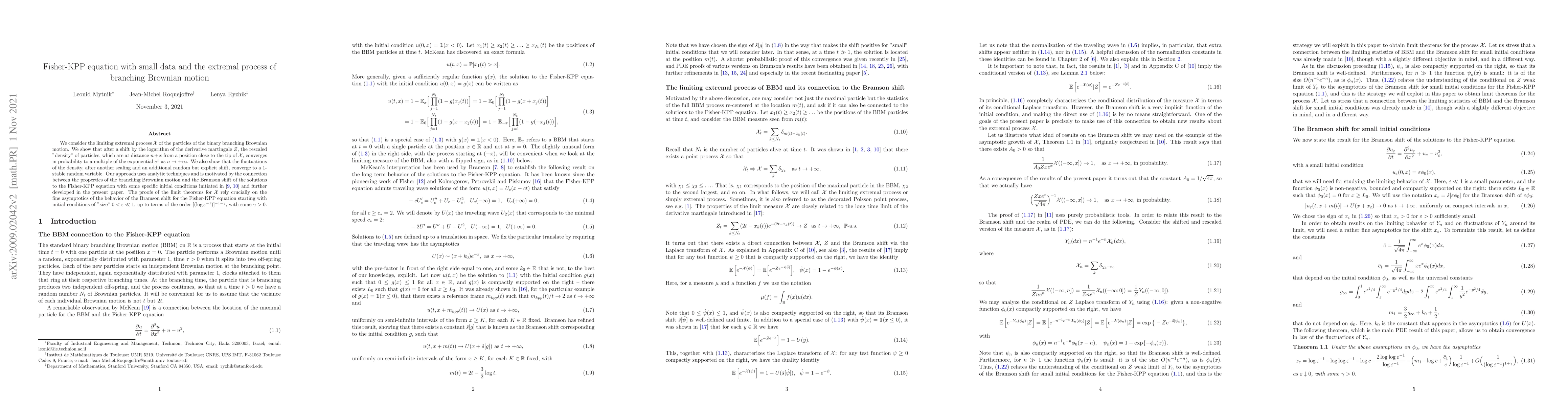 We consider the limiting extremal process ${\mathcal X}$ of the particles of the binary branching Brownian motion. We show that after a shift by the logarithm of the derivative martingale $Z$, the rescaled "density" of particles, which are at distance $n+x$ from a position close to the tip of ${\mathcal X}$, converges in probability to a multiple of the exponential $e^x$ as $n\to+\infty$. We also show that the fluctuations of the density, after another scaling and an additional random but explicit shift, converge to a $1$-stable random variable. Our approach uses analytic techniques and is motivated by the connection between the properties of the branching Brownian motion and the Bramson shift of the solutions to the Fisher-KPP equation with some specific initial conditions initiated in \cite{BD1,BD2} and further developed in the present paper. The proofs of the limit theorems for ${\mathcal X}$ rely crucially on the fine asymptotics of the behavior of the Bramson shift for the Fisher-KPP equation starting with initial conditions of "size" $0<\varepsilon\ll 1$, up to terms of the order $[{(\log \varepsilon^{-1})]^{-1-\gamma}}$, with some $\gamma>0$.