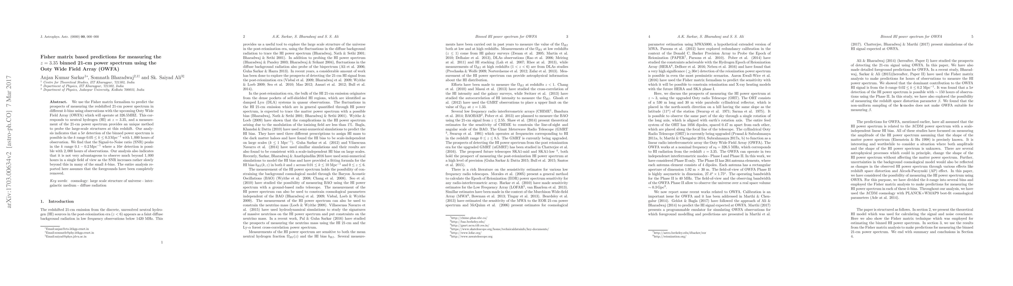 We use the Fisher matrix formalism to predict the prospects of measuring the redshifted 21-cm power spectrum in different $k$-bins using observations with the upcoming Ooty Wide Field Array (OWFA) which will operate at $326.5 {\rm MHZ}$. This corresponds to neutral hydrogen (HI) at $z=3.35$, and a measurement of the 21-cm power spectrum provides an unique method to probe the large-scale structures at this redshift. Our analysis indicates that a $5 \sigma$ detection of the binned power spectrum is possible in the $k$ range $0.05 \leq k \leq 0.3 \, {\rm Mpc}^{-1}$ with $1,000$ hours of observation. We find that the Signal-to-Noise ratio (${\rm SNR}$) peaks in the $k$ range $0.1- 0.2\, {\rm Mpc}^{-1}$ where a $10 \sigma$ detection is possible with $2,000$ hours of observations. Our analysis also indicates that it is not very advantageous to observe much beyond $1,000$ hours in a single field of view as the ${\rm SNR}$ increases rather slowly beyond this in many of the small $k$-bins. The entire analysis reported here assumes that the foregrounds have been completely removed.