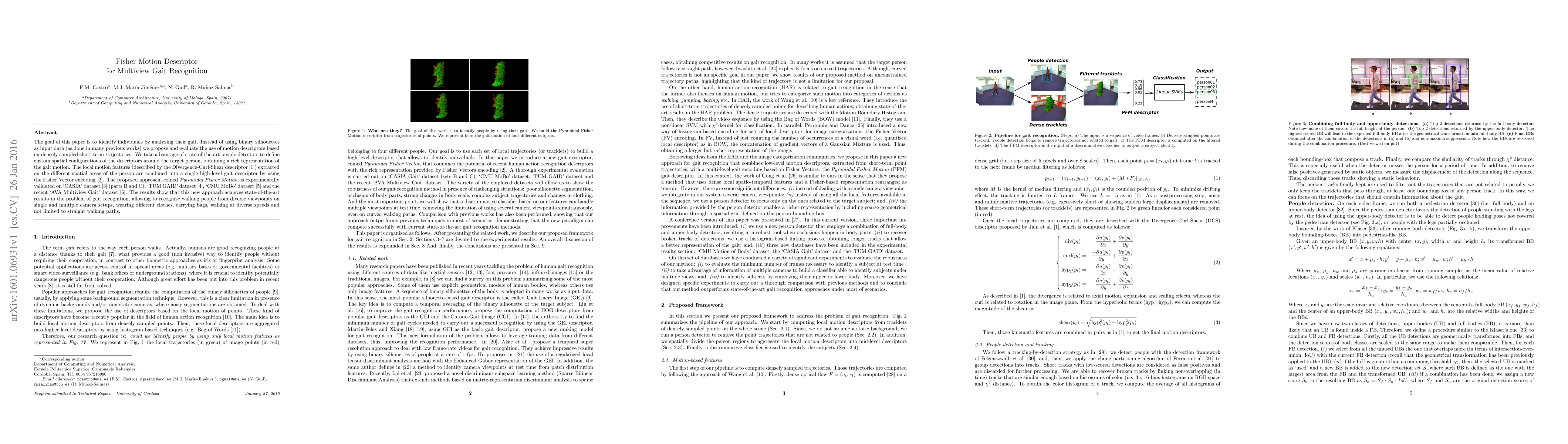 The goal of this paper is to identify individuals by analyzing their gait. Instead of using binary silhouettes as input data (as done in many previous works) we propose and evaluate the use of motion descriptors based on densely sampled short-term trajectories. We take advantage of state-of-the-art people detectors to define custom spatial configurations of the descriptors around the target person, obtaining a rich representation of the gait motion. The local motion features (described by the Divergence-Curl-Shear descriptor) extracted on the different spatial areas of the person are combined into a single high-level gait descriptor by using the Fisher Vector encoding. The proposed approach, coined Pyramidal Fisher Motion, is experimentally validated on `CASIA' dataset (parts B and C), `TUM GAID' dataset, `CMU MoBo' dataset and the recent `AVA Multiview Gait' dataset. The results show that this new approach achieves state-of-the-art results in the problem of gait recognition, allowing to recognize walking people from diverse viewpoints on single and multiple camera setups, wearing different clothes, carrying bags, walking at diverse speeds and not limited to straight walking paths.