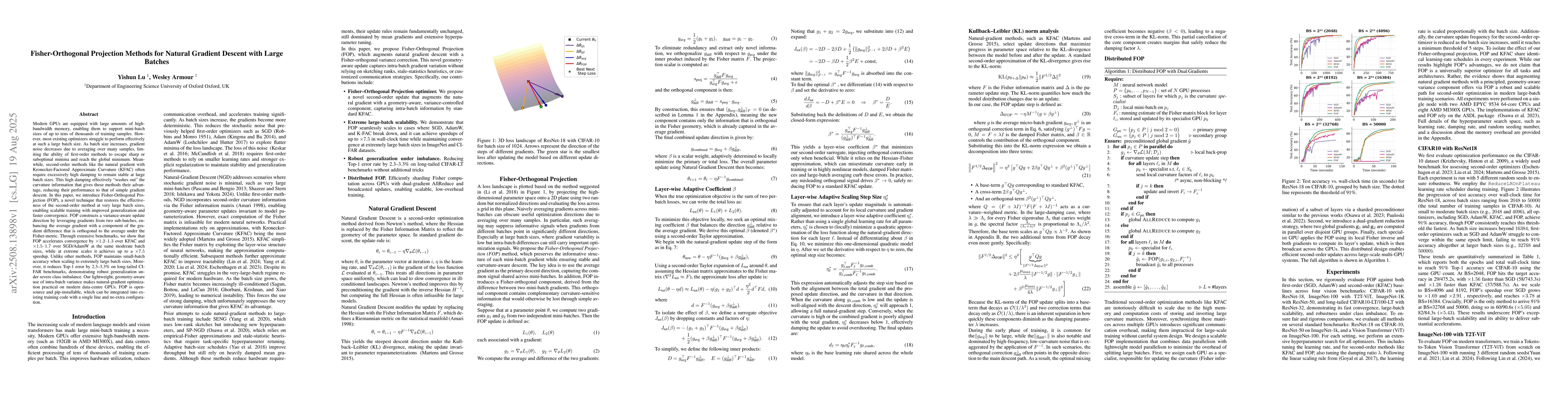 Modern GPUs are equipped with large amounts of high-bandwidth memory, enabling them to support mini-batch sizes of up to tens of thousands of training samples. However, most existing optimizers struggle to perform effectively at such a large batch size. As batch size increases, gradient noise decreases due to averaging over many samples, limiting the ability of first-order methods to escape sharp or suboptimal minima and reach the global minimum. Meanwhile, second-order methods like the natural gradient with Kronecker-Factored Approximate Curvature (KFAC) often require excessively high damping to remain stable at large batch sizes. This high damping effectively washes out the curvature information that gives these methods their advantage, reducing their performance to that of simple gradient descent. In this paper, we introduce Fisher-Orthogonal Projection (FOP), a novel technique that restores the effectiveness of the second-order method at very large batch sizes, enabling scalable training with improved generalization and faster convergence. FOP constructs a variance-aware update direction by leveraging gradients from two sub-batches, enhancing the average gradient with a component of the gradient difference that is orthogonal to the average under the Fisher-metric.