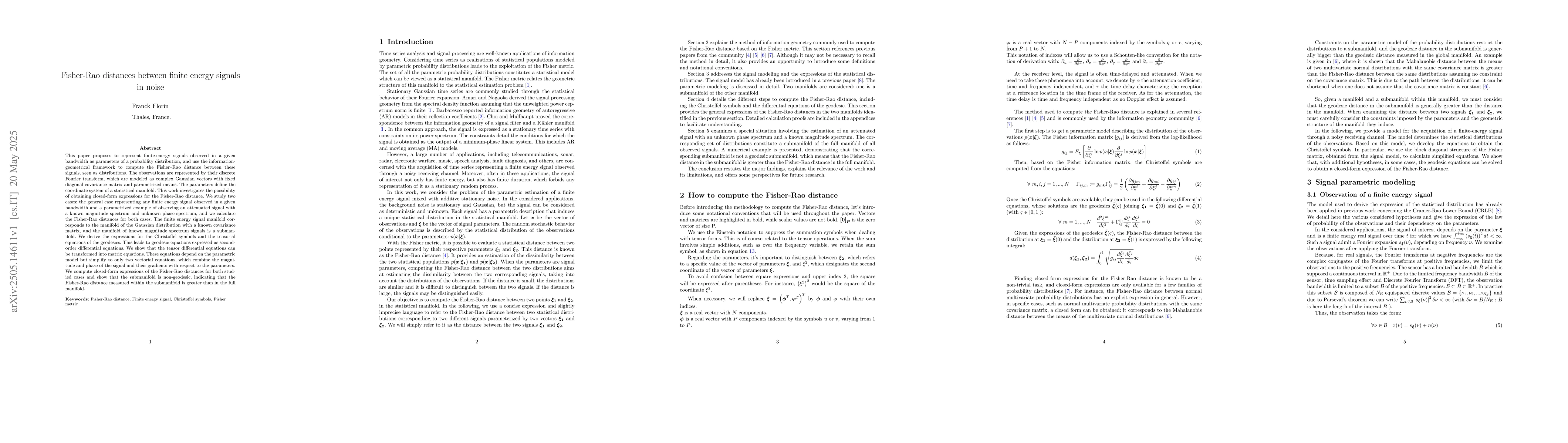 This work is novel in its application of the Fisher-Rao geometrical framework to finite energy signals in noise, providing explicit distance measures and geodesic equations, which can be useful in various signal processing and statistical inference tasks.