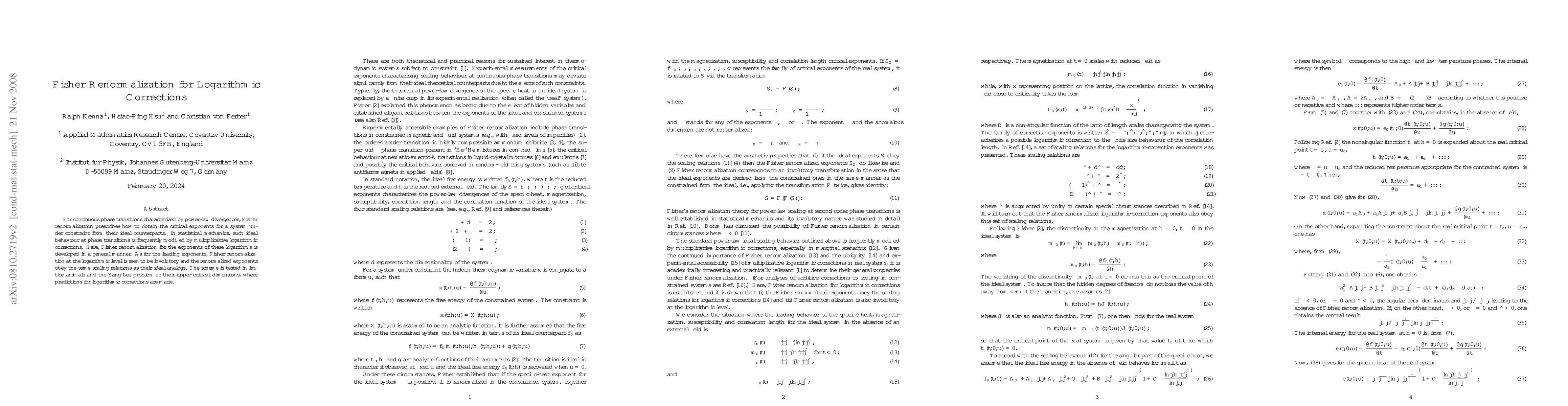 This paper develops Fisher renormalization for logarithmic corrections in continuous phase transitions, showing that it is involutory and maintains the same scaling relations as ideal critical exponents. The method is tested in lattice animals and the Yang-Lee problem to predict logarithmic corrections at upper critical dimensions.