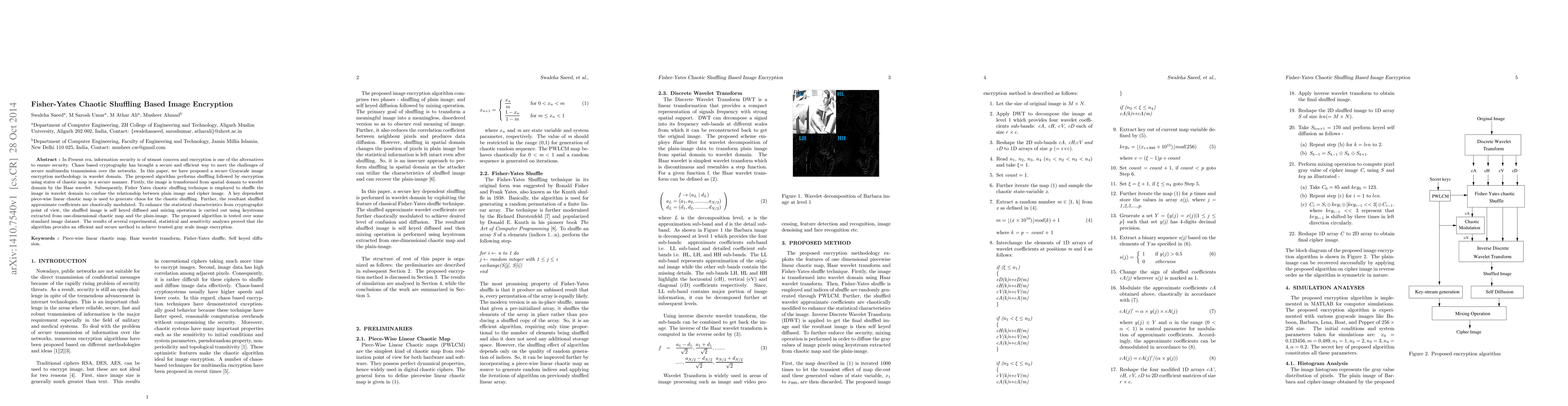 This paper proposes a secure grayscale image encryption method using wavelet transformation and Fisher-Yates chaotic shuffling. The algorithm employs chaotic modulation and diffusion techniques to enhance security, demonstrating efficient and robust encryption through experimental and statistical analyses.