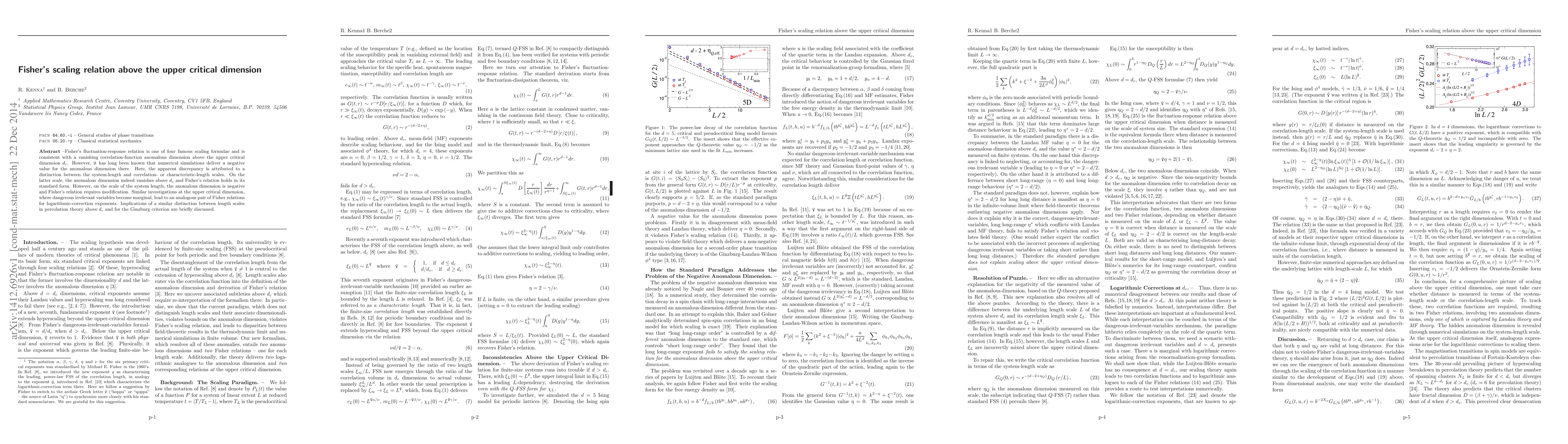 Fisher's fluctuation-response relation is one of four famous scaling formulae and is consistent with a vanishing correlation-function anomalous dimension above the upper critical dimension d_c. However, it has long been known that numerical simulations deliver a negative value for the anomalous dimension there. Here, the apparent discrepancy is attributed to a distinction between the system-length and correlation- or characteristic-length scales. On the latter scale, the anomalous dimension indeed vanishes above d_c and Fisher's relation holds in its standard form. However, on the scale of the system length, the anomalous dimension is negative and Fisher's relation requires modification. Similar investigations at the upper critical dimension, where dangerous irrelevant variables become marginal, lead to an analogous pair of Fisher relations for logarithmic-correction exponents. Implications of a similar distinction between length scales in percolation theory above d_c and for the Ginzburg criterion are briefly discussed.