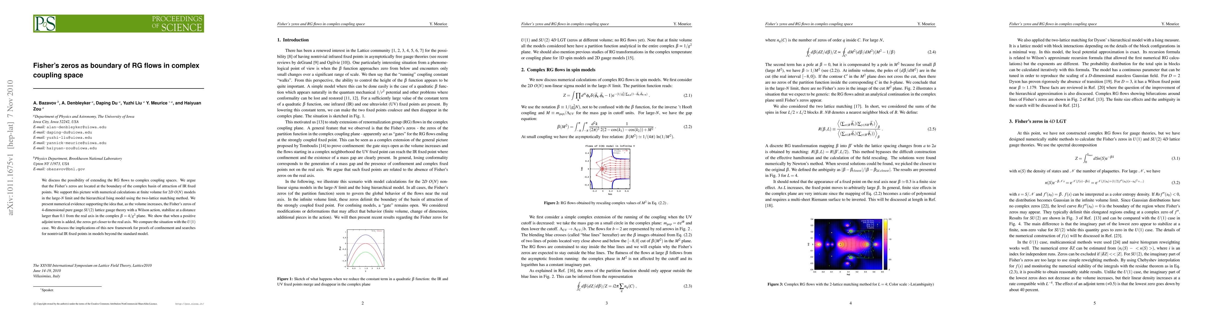 We discuss the possibility of extending the RG flows to complex coupling spaces. We argue that the Fisher's zeros are located at the boundary of the complex basin of attraction of IR fixed points. We support this picture with numerical calculations at finite volume for2D O(N) models in the large-N limit and the hierarchical Ising model using the two-lattice matching method. We present numerical evidence supporting the idea that, as the volume increases, the Fisher's zeros of 4-dimensional pure gauge SU(2) lattice gauge theory with a Wilson action, stabilize at a distance larger than 0.1 from the real axis in the complex beta=4/g^2 plane. We show that when a positive adjoint term is added, the zeros get closer to the real axis. We compare the situation with the U(1) case. We discuss the implications of this new framework for proofs of confinement and searches for nontrivial IR fixed points in models beyond the standard model.