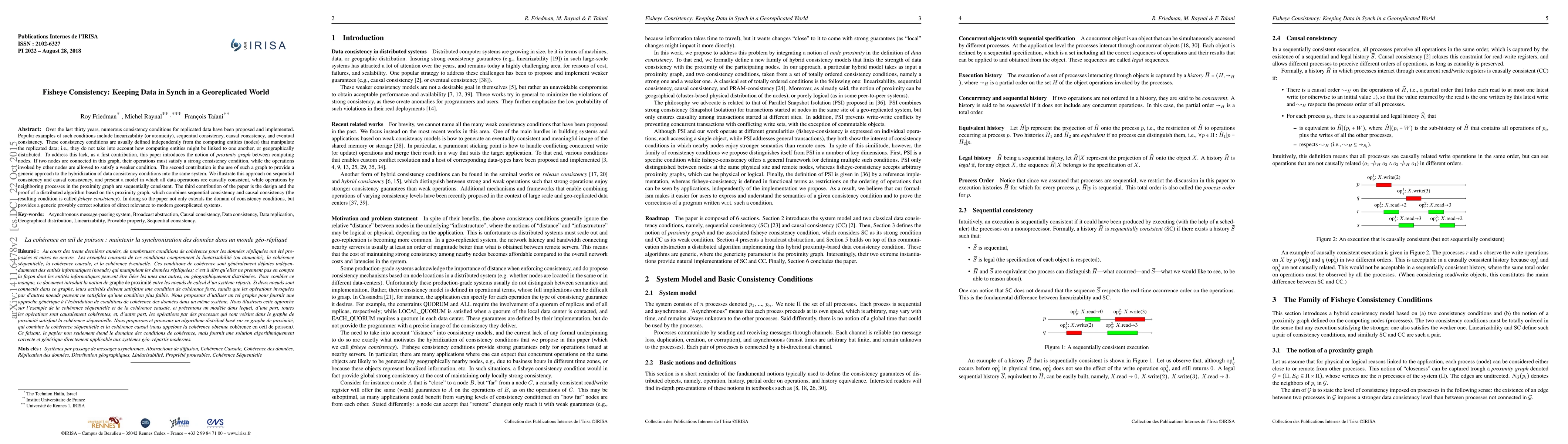 Over the last thirty years, numerous consistency conditions for replicated data have been proposed and implemented. Popular examples of such conditions include linearizability (or atomicity), sequential consistency, causal consistency, and eventual consistency. These consistency conditions are usually defined independently from the computing entities (nodes) that manipulate the replicated data; i.e., they do not take into account how computing entities might be linked to one another, or geographically distributed. To address this lack, as a first contribution, this paper introduces the notion of proximity graph between computing nodes. If two nodes are connected in this graph, their operations must satisfy a strong consistency condition, while the operations invoked by other nodes are allowed to satisfy a weaker condition. The second contribution is the use of such a graph to provide a generic approach to the hybridization of data consistency conditions into the same system. We illustrate this approach on sequential consistency and causal consistency, and present a model in which all data operations are causally consistent, while operations by neighboring processes in the proximity graph are sequentially consistent. The third contribution of the paper is the design and the proof of a distributed algorithm based on this proximity graph, which combines sequential consistency and causal consistency (the resulting condition is called fisheye consistency). In doing so the paper not only extends the domain of consistency conditions, but provides a generic provably correct solution of direct relevance to modern georeplicated systems.