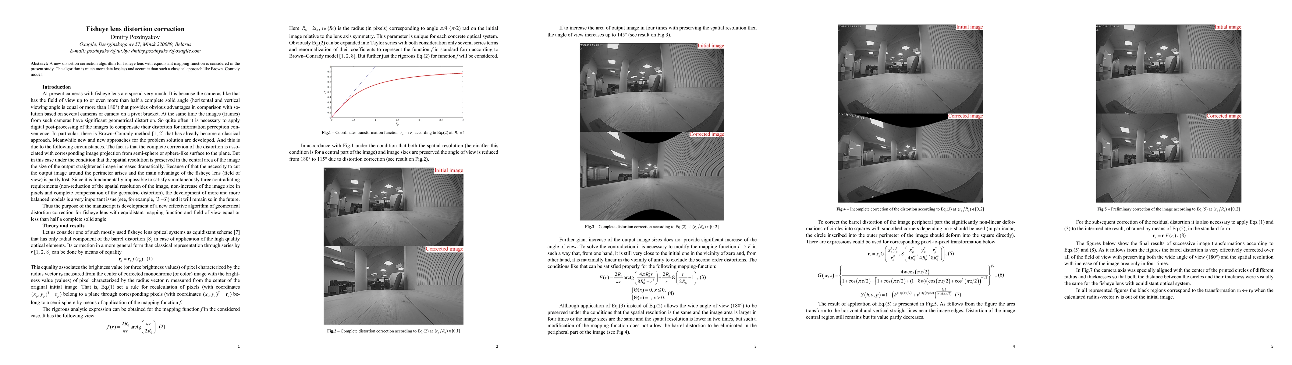 Summary: This paper introduces a new distortion correction algorithm for fisheye lenses, employing an equidistant mapping function that offers higher accuracy and data losslessness compared to the classical Brown-Conrady model.