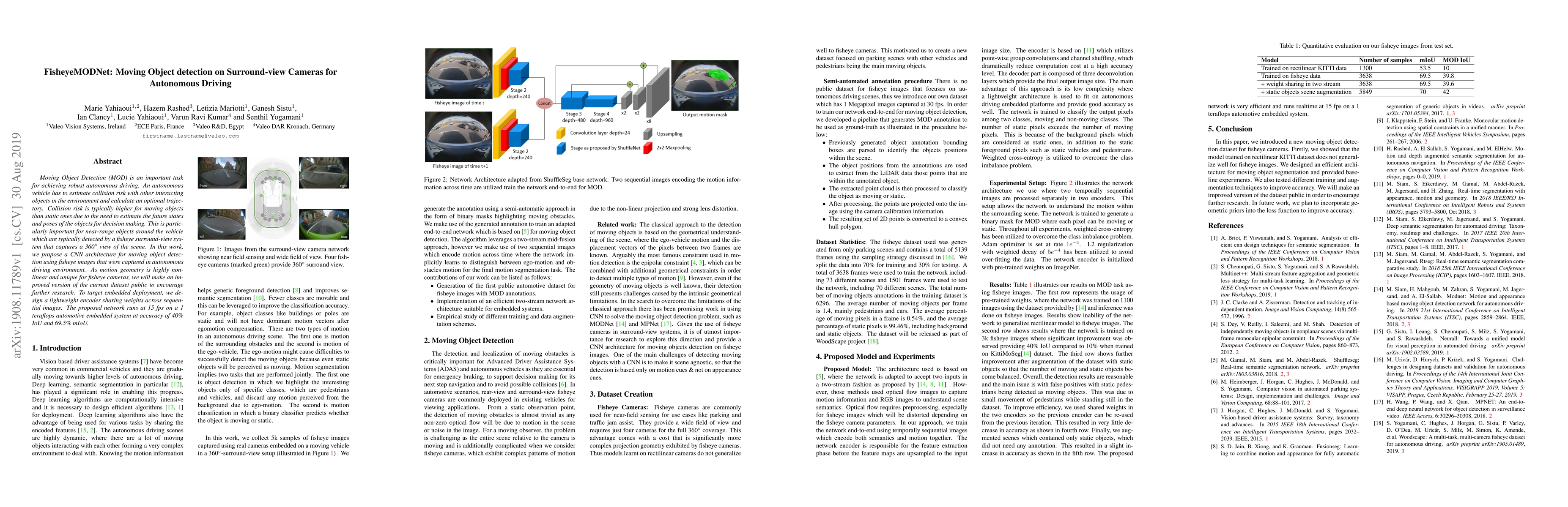 FisheyeMODNet proposes a CNN architecture for detecting moving objects in autonomous driving using fisheye surround-view camera images. The network achieves 15 fps on embedded systems with 40% IoU and 69.5% mIoU accuracy, emphasizing the unique motion geometry of fisheye cameras.