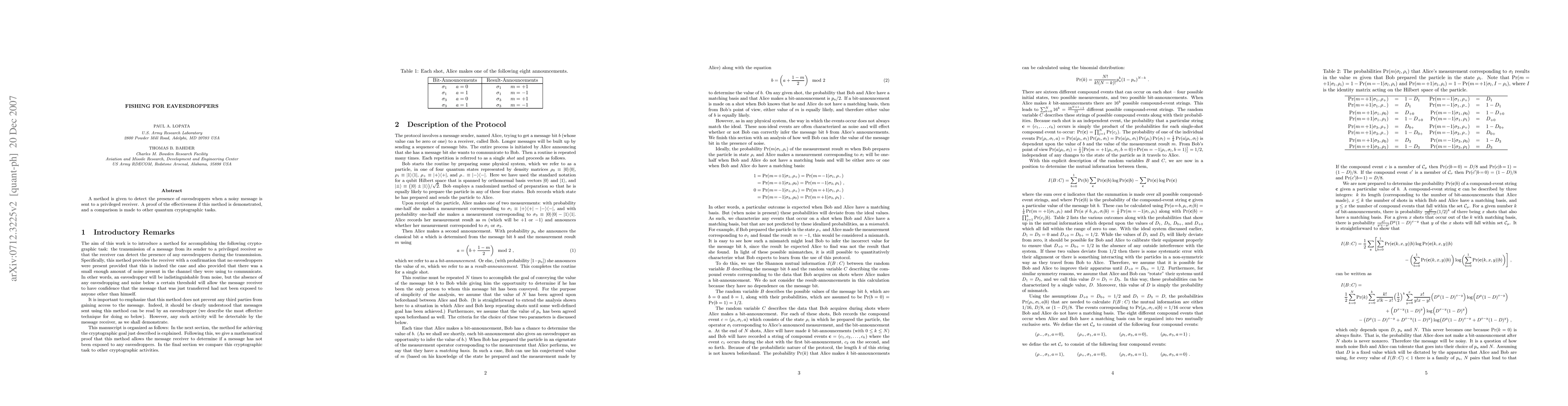 Summary: This paper presents a novel method for detecting eavesdroppers in noisy quantum communication channels, proving its effectiveness and comparing it to other quantum cryptographic techniques. The proposed method aims to enhance secure communication by identifying potential interceptors.