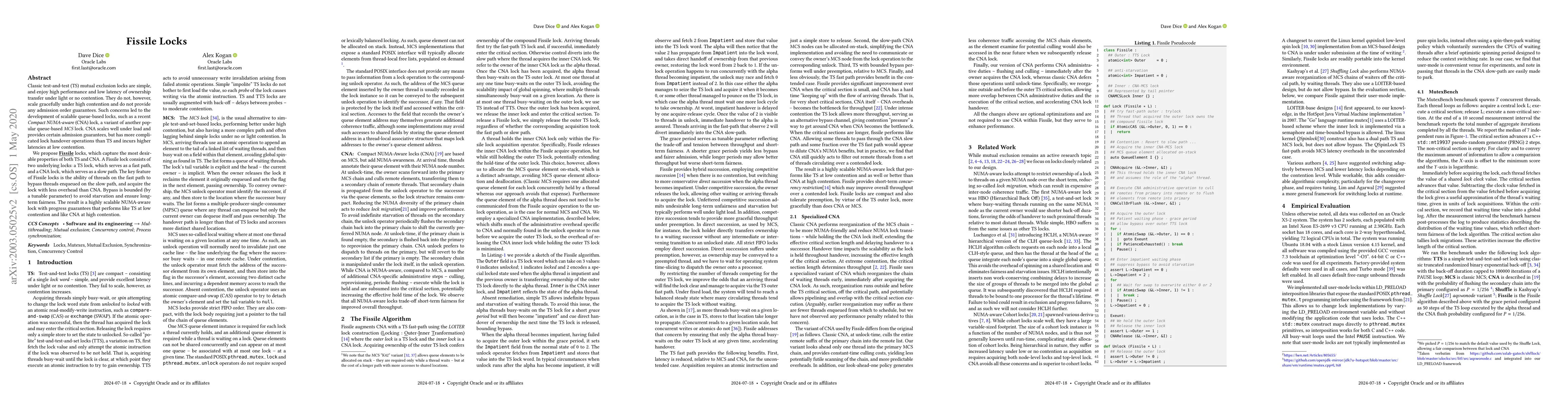 Fissile locks combine the low-latency performance of test-and-test (TS) mutual exclusion locks with the scalability of Compact NUMA-aware (CNA) locks, offering a fast path for low contention and a slow path for high contention while ensuring fairness and scalability.