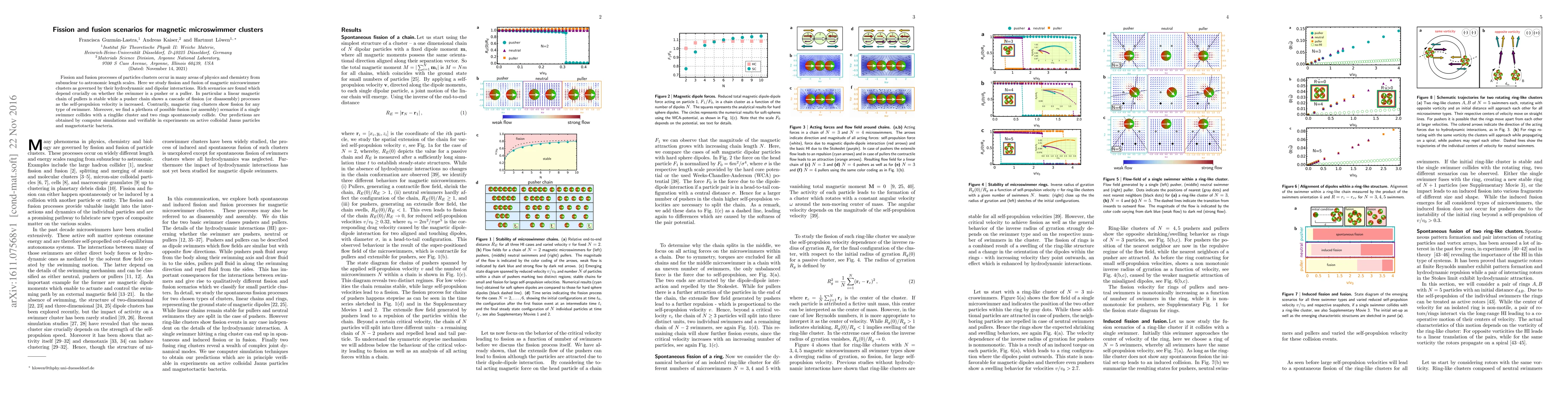 This paper examines fission and fusion behaviors in clusters of magnetic microswimmers driven by hydrodynamic and dipolar interactions, revealing distinct behaviors depending on whether swimmers are pushers or pullers. Linear chains of pullers are stable, while pushers exhibit fission cascades, and magnetic ring clusters undergo fission regardless of swimmer type, with various fusion scenarios possible upon collisions.