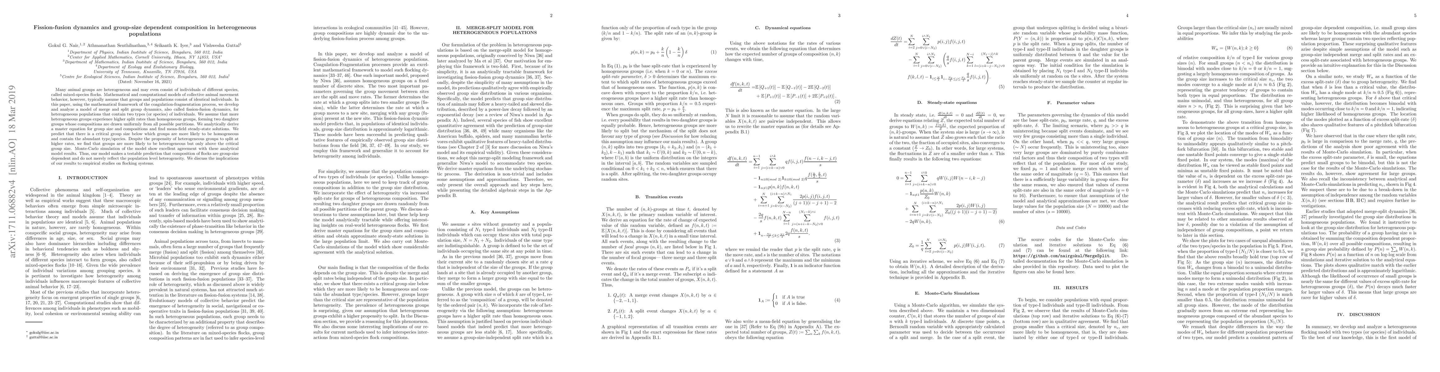 This paper develops a mathematical model to analyze fission-fusion dynamics in heterogeneous populations, predicting that group composition depends on group size, with larger groups more likely to be heterogeneous. Analytical and simulation results support the model's predictions, suggesting implications for empirical studies on mixed-species flocks.