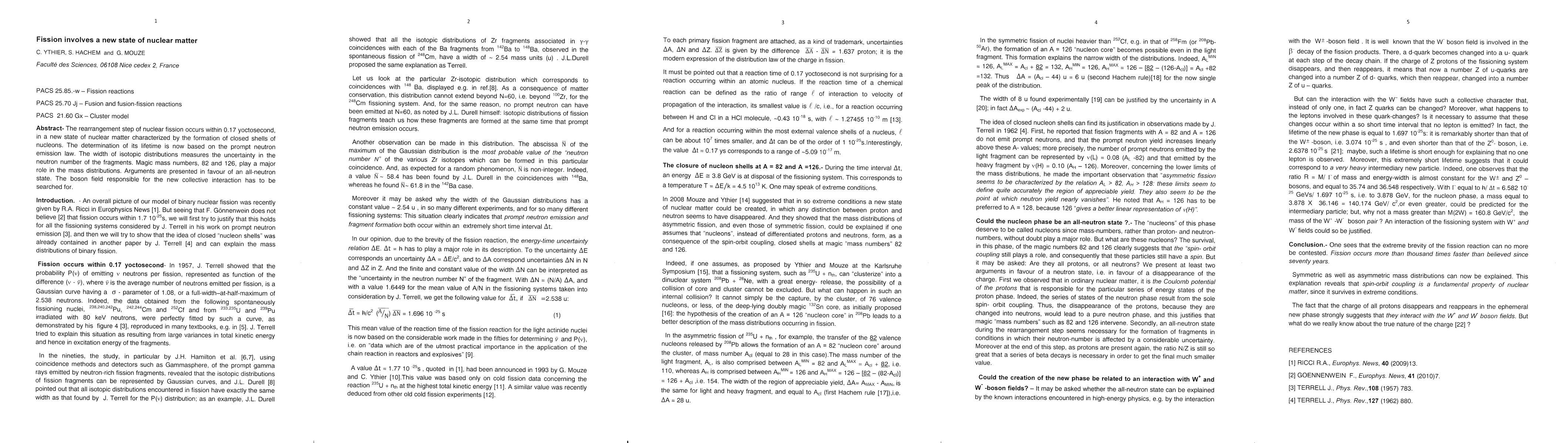 The rearrangement step of nuclear fission occurs within 0.17 yoctosecond, in a new state of nuclear matter characterized by the formation of closed shells of nucleons. The determination of its lifetime is now based on the prompt neutron emission law. The width of isotopic distributions measures the uncertainty in the neutron number of the fragments. Magic mass numbers, 82 and 126, play a major role in the mass distributions. Arguments are presented in favour of an all-neutron state. The boson field responsible for the new collective interaction has to be searched for.