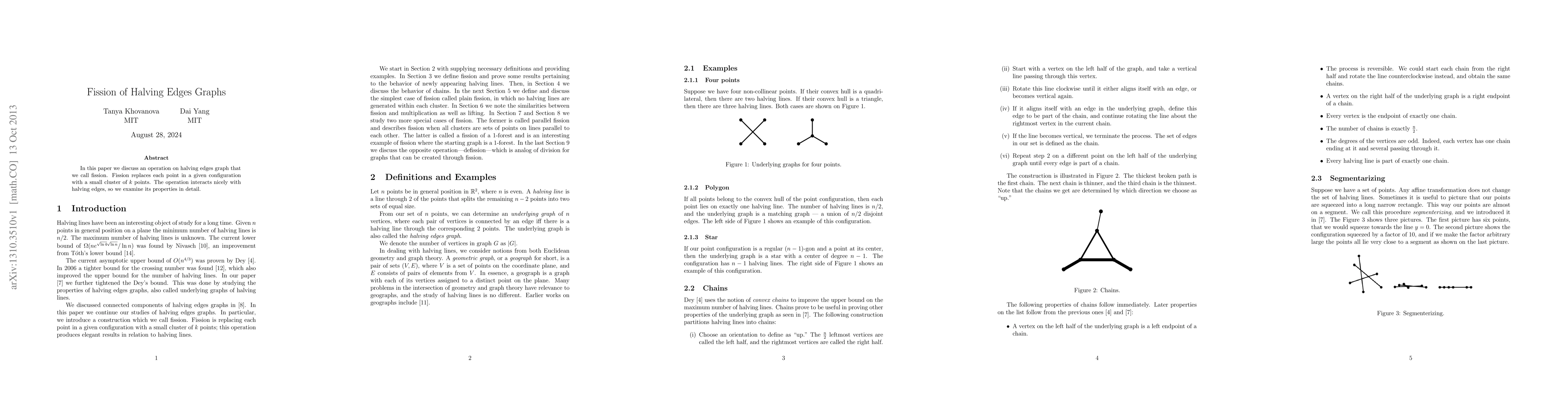 This paper introduces fission, an operation on halving edges graphs that replaces each point with a small cluster of k points, and explores its properties, noting its compatibility with halving edges.