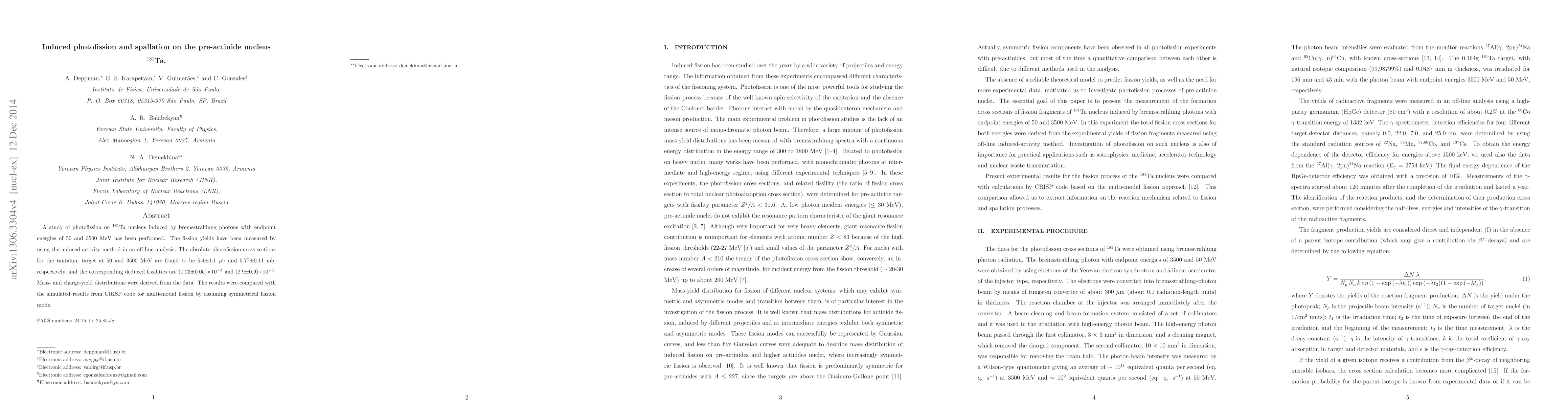 A study of photofission on 181Ta nucleus induced by bremsstrahlung photons with endpoint energies of 50 and 3500 MeV has been performed. The fission yields have been measured by using the induced-activity method in an off-line analysis. The absolute photofission cross sections for the tantalum target at 50 and 3500 MeV are found to be 5.4 \pm 1.1 microb and 0.77\pm0.11 mb, respectively, and the corresponding deduced fissilities are (0.23\pm0.05) x 10^{-3} and (2.9 \pm 0.9) x 10^{-3}. Mass- and charge-yield distributions were derived from the data. The results were compared with the simulated results from CRISP code for multi-modal fission by assuming symmetrical fission mode.