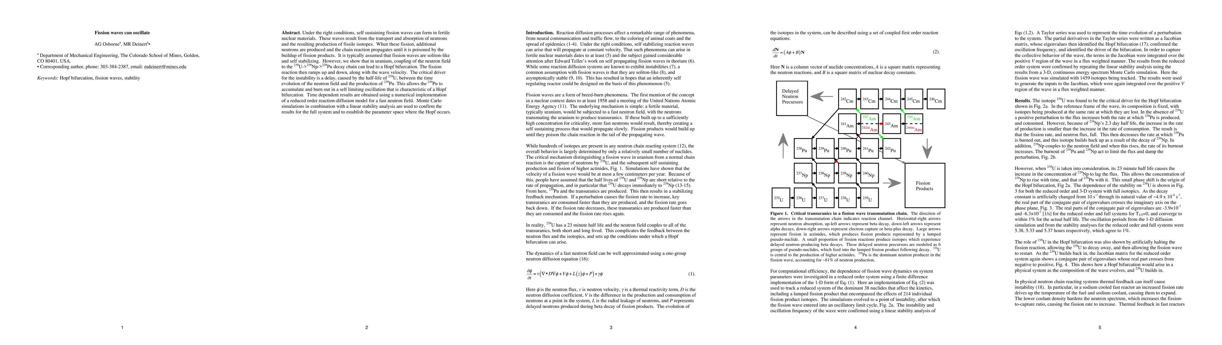 Under the right conditions, self sustaining fission waves can form in fertile nuclear materials. These waves result from the transport and absorption of neutrons and the resulting production of fissile isotopes. When these fission, additional neutrons are produced and the chain reaction propagates until it is poisoned by the buildup of fission products. It is typically assumed that fission waves are soliton-like and self stabilizing. However, we show that in uranium, coupling of the neutron field to the 239U->239Np->239Pu decay chain can lead to a Hopf bifurcation. The fission reaction then ramps up and down, along with the wave velocity. The critical driver for the instability is a delay, caused by the half-life of 239U, between the time evolution of the neutron field and the production of 239Pu. This allows the 239Pu to accumulate and burn out in a self limiting oscillation that is characteristic of a Hopf bifurcation. Time dependent results are obtained using a numerical implementation of a reduced order reaction-diffusion model for a fast neutron field. Monte Carlo simulations in combination with a linear stability analysis are used to confirm the results for the full system and to establish the parameter space where the Hopf occurs.