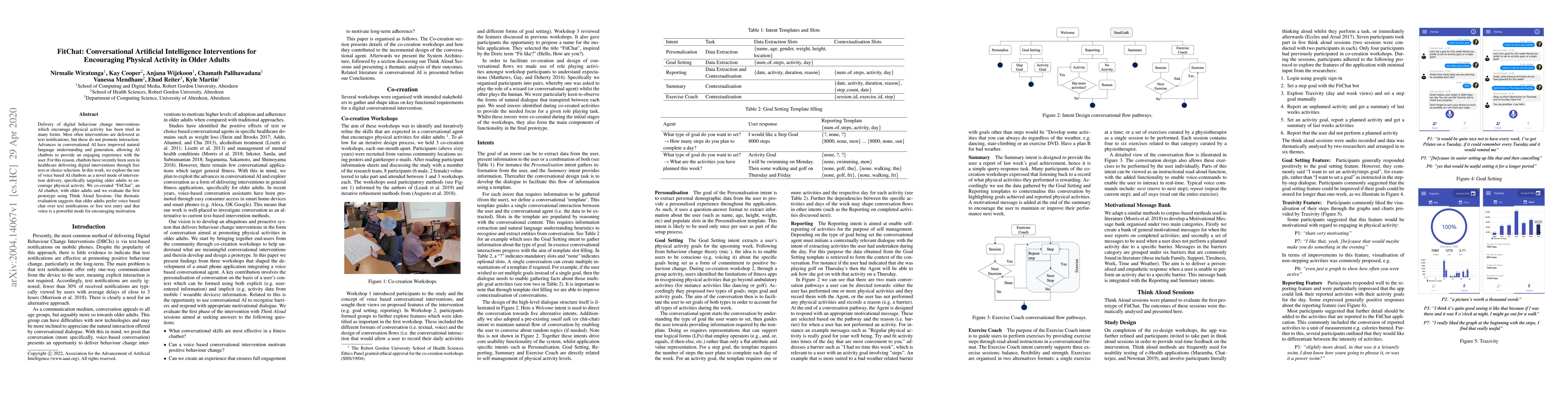 Delivery of digital behaviour change interventions which encourage physical activity has been tried in many forms. Most often interventions are delivered as text notifications, but these do not promote interaction. Advances in conversational AI have improved natural language understanding and generation, allowing AI chatbots to provide an engaging experience with the user. For this reason, chatbots have recently been seen in healthcare delivering digital interventions through free text or choice selection. In this work, we explore the use of voice-based AI chatbots as a novel mode of intervention delivery, specifically targeting older adults to encourage physical activity. We co-created "FitChat", an AI chatbot, with older adults and we evaluate the first prototype using Think Aloud Sessions. Our thematic evaluation suggests that older adults prefer voice-based chat over text notifications or free text entry and that voice is a powerful mode for encouraging motivation.