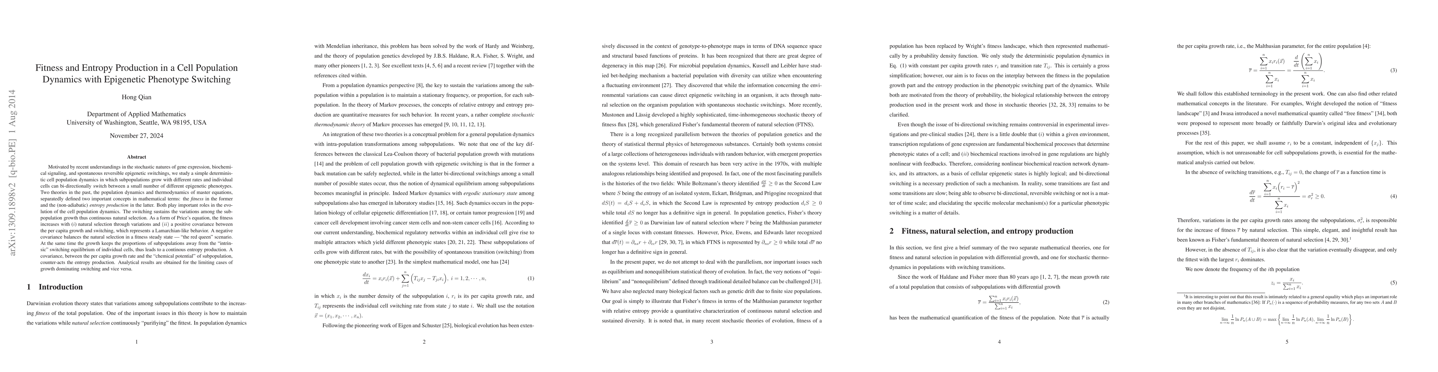 Motivated by recent understandings in the stochastic natures of gene expression, biochemical signaling, and spontaneous reversible epigenetic switchings, we study a simple deterministic cell population dynamics in which subpopulations grow with different rates and individual cells can bi-directionally switch between a small number of different epigenetic phenotypes. Two theories in the past, the population dynamics and thermodynamics of master equations, separatedly defined two important concepts in mathematical terms: the {\em fitness} in the former and the (non-adiabatic) {\em entropy production} in the latter. Both play important roles in the evolution of the cell population dynamics. The switching sustains the variations among the subpopulation growth thus continuous natural selection. As a form of Price's equation, the fitness increases with ($i$) natural selection through variations and $(ii)$ a positive covariance between the per capita growth and switching, which represents a Lamarchian-like behavior. A negative covariance balances the natural selection in a fitness steady state | "the red queen" scenario. At the same time the growth keeps the proportions of subpopulations away from the "intrinsic" switching equilibrium of individual cells, thus leads to a continous entropy production. A covariance, between the per capita growth rate and the "chemical potential" of subpopulation, counter-acts the entropy production. Analytical results are obtained for the limiting cases of growth dominating switching and vice versa.
