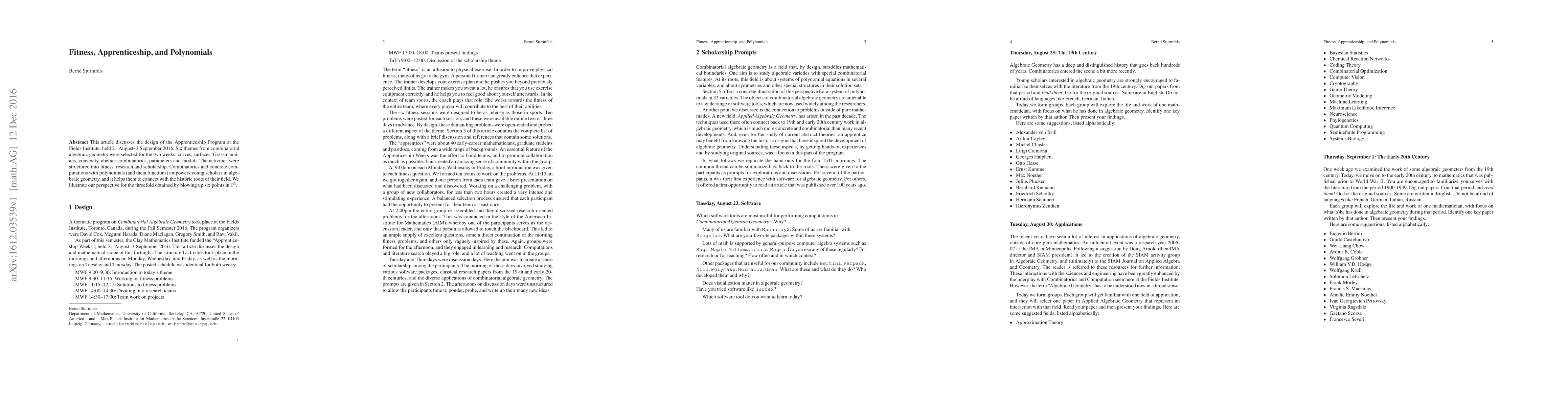 This article discusses the design of the Apprenticeship Program at the Fields Institute, held 21 August - 3 September 2016. Six themes from combinatorial algebraic geometry were selected for the two weeks: curves, surfaces, Grassmannians, convexity, abelian combinatorics, parameters and moduli. The activities were structured into fitness, research and scholarship. Combinatorics and concrete computations with polynomials (and theta functions) empowers young scholars in algebraic geometry, and it helps them to connect with the historic roots of their field. We illustrate our perspective for the threefold obtained by blowing up six points in $\mathbb{P}^3$.