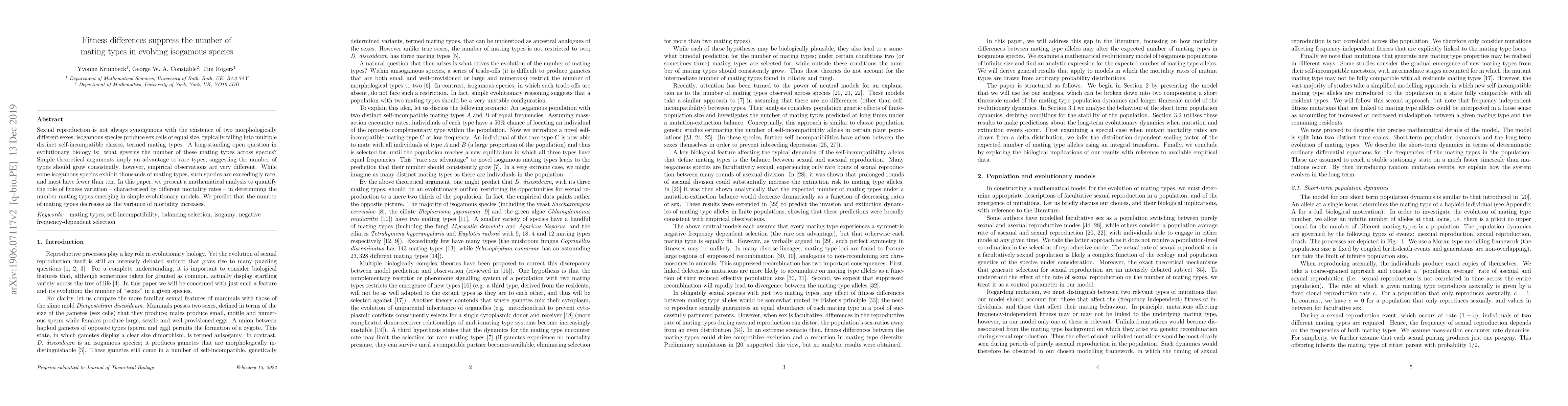 Sexual reproduction is not always synonymous with the existence of two morphologically different sexes; isogamous species produce sex cells of equal size, typically falling into multiple distinct self-incompatible classes, termed mating types. A long-standing open question in evolutionary biology is: what governs the number of these mating types across species? Simple theoretical arguments imply an advantage to rare types, suggesting the number of types should grow consistently, however, empirical observations are very different. While some isogamous species exhibit thousands of mating types, such species are exceedingly rare, and most have fewer than ten. In this paper, we present a mathematical analysis to quantify the role of fitness variation - characterised by different mortality rates - in determining the number mating types emerging in simple evolutionary models. We predict that the number of mating types decreases as the variance of mortality increases.