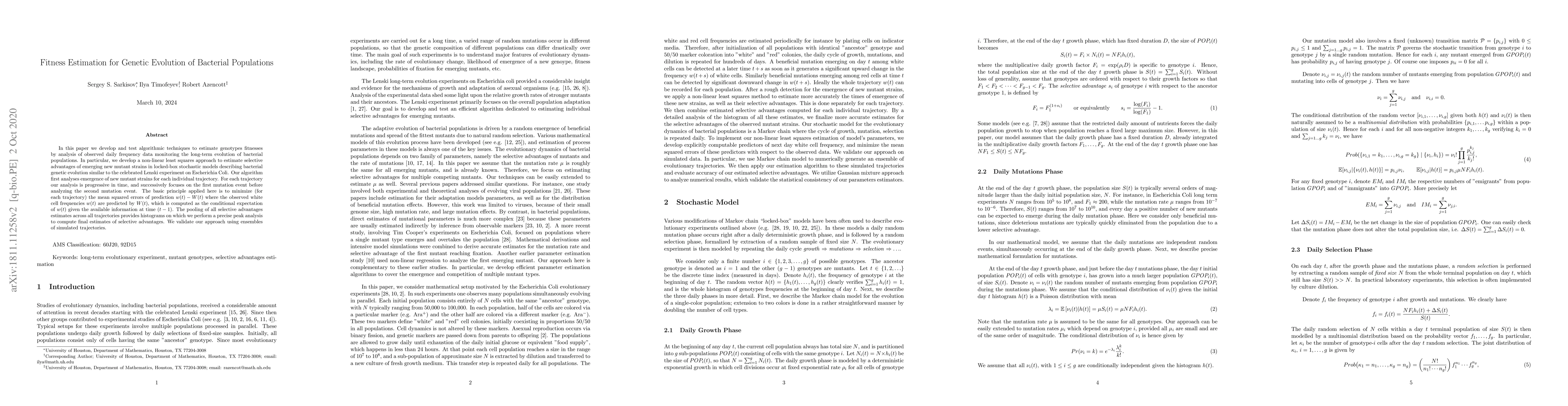 This paper develops a non-linear least squares algorithm to estimate the fitness of genotypes in bacterial populations by analyzing daily frequency data. The method progressively assesses the selective advantages of new mutant strains in stochastic models, validated through simulated ensembles.