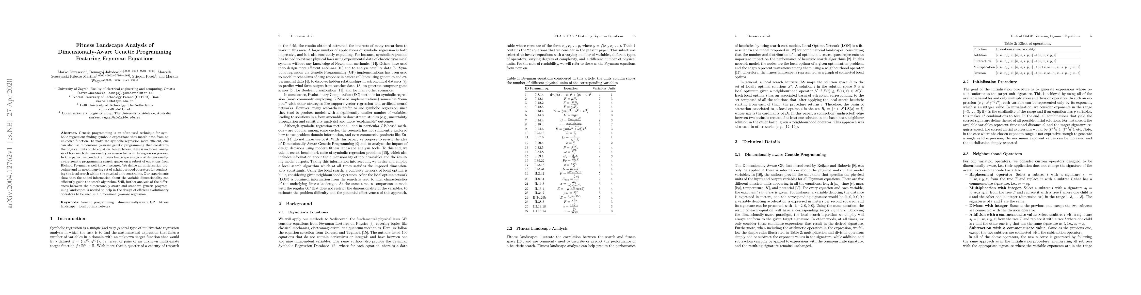 Genetic programming is an often-used technique for symbolic regression: finding symbolic expressions that match data from an unknown function. To make the symbolic regression more efficient, one can also use dimensionally-aware genetic programming that constrains the physical units of the equation. Nevertheless, there is no formal analysis of how much dimensionality awareness helps in the regression process. In this paper, we conduct a fitness landscape analysis of dimensionallyaware genetic programming search spaces on a subset of equations from Richard Feynmans well-known lectures. We define an initialisation procedure and an accompanying set of neighbourhood operators for conducting the local search within the physical unit constraints. Our experiments show that the added information about the variable dimensionality can efficiently guide the search algorithm. Still, further analysis of the differences between the dimensionally-aware and standard genetic programming landscapes is needed to help in the design of efficient evolutionary operators to be used in a dimensionally-aware regression.