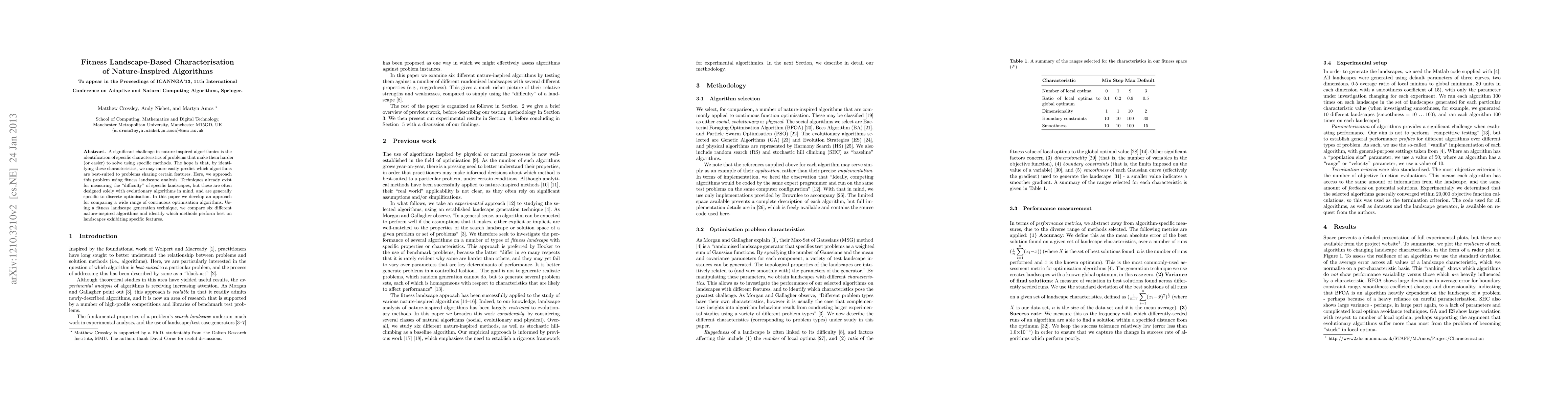 A significant challenge in nature-inspired algorithmics is the identification of specific characteristics of problems that make them harder (or easier) to solve using specific methods. The hope is that, by identifying these characteristics, we may more easily predict which algorithms are best-suited to problems sharing certain features. Here, we approach this problem using fitness landscape analysis. Techniques already exist for measuring the "difficulty" of specific landscapes, but these are often designed solely with evolutionary algorithms in mind, and are generally specific to discrete optimisation. In this paper we develop an approach for comparing a wide range of continuous optimisation algorithms. Using a fitness landscape generation technique, we compare six different nature-inspired algorithms and identify which methods perform best on landscapes exhibiting specific features.