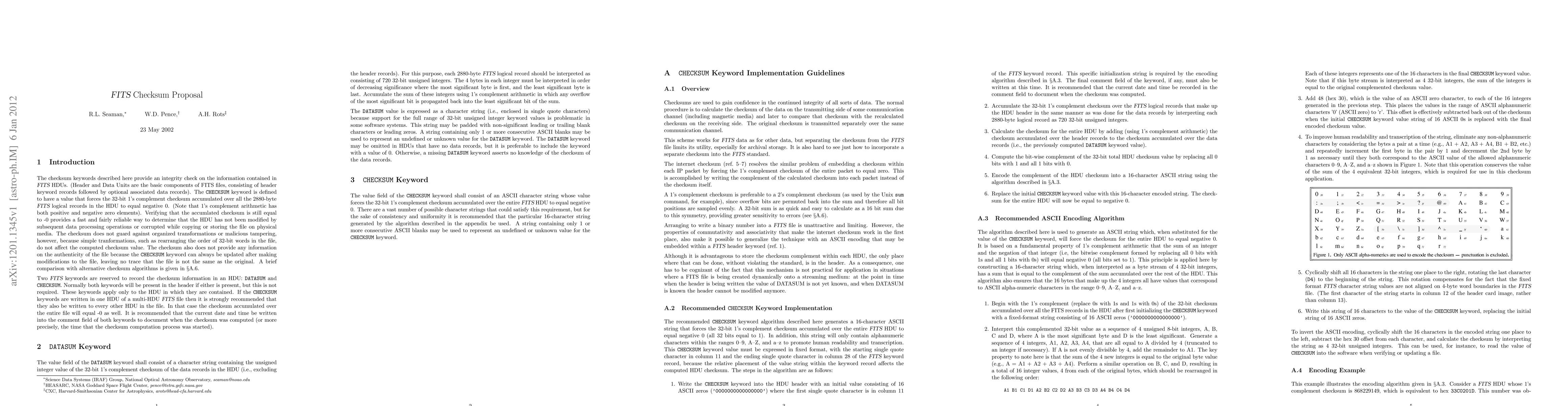 This paper proposes the use of a CHECKSUM keyword in FITS files to ensure data integrity by calculating a 32-bit 1's complement checksum over all 2880-byte logical records in the HDU, verifying that the accumulated checksum equals negative zero to confirm the HDU has not been modified or corrupted.