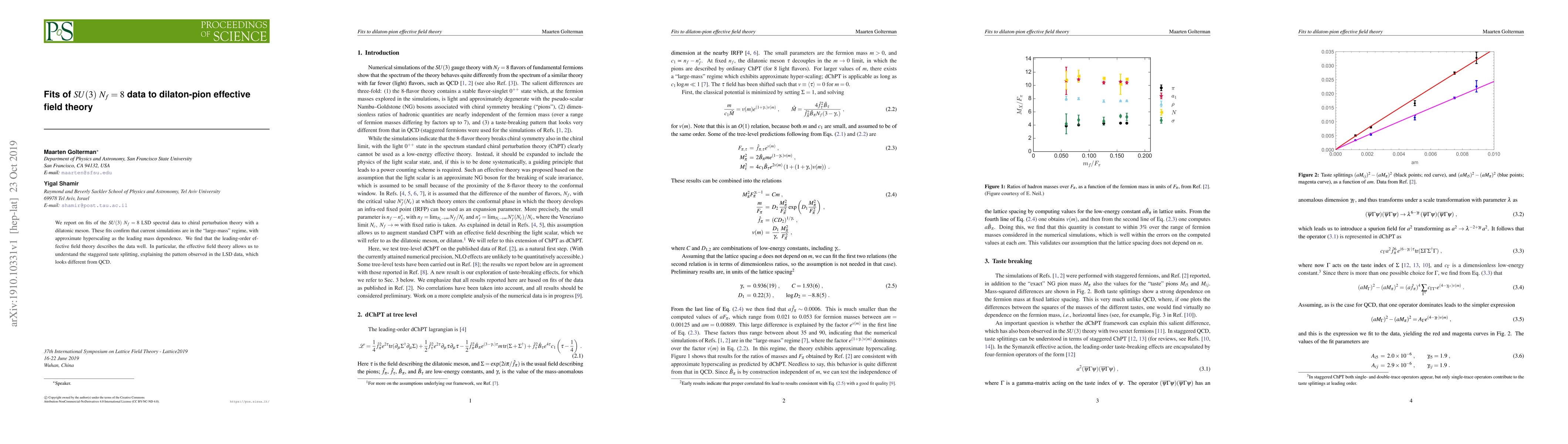 We report on fits of the $SU(3)$ $N_f=8$ LSD spectral data to chiral perturbation theory with a dilatonic meson. These fits confirm that current simulations are in the "large-mass" regime, with approximate hyperscaling as the leading mass dependence. We find that the leading-order effective field theory describes the data well. In particular, the effective field theory allows us to understand the staggered taste splitting, explaining the pattern observed in the LSD data, which looks different from QCD.
