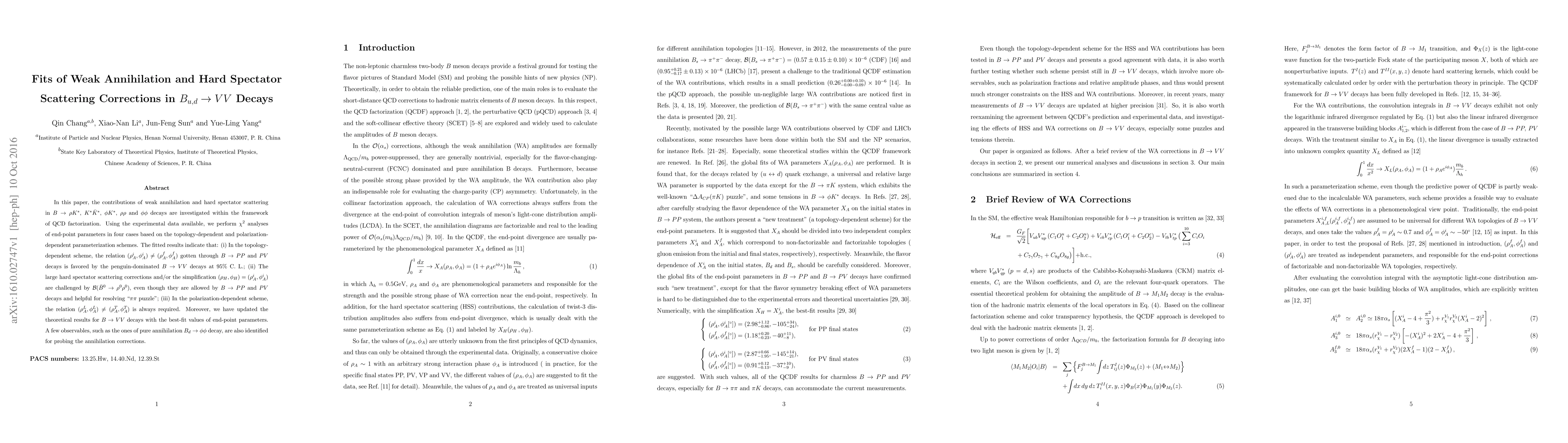 In this paper, the contributions of weak annihilation and hard spectator scattering in $B\to \rho K^*$, $ K^* \bar{K}^*$, $\phi K^*$, $\rho\rho$ and $\phi\phi$ decays are investigated within the framework of QCD factorization. Using the experimental data available, we perform $\chi^2$ analyses of end-point parameters in four cases based on the topology-dependent and polarization-dependent parameterization schemes. The fitted results indicate that: (i) In the topology-dependent scheme, the relation $(\rho_A^{i},\phi_A^{i})\neq (\rho_A^{f},\phi_A^{f})$ gotten through $B\to PP$ and $PV$ decays is favored by the penguin-dominated $B\to VV$ decays at 95\% C. L., (ii) The large hard spectator scattering corrections and/or the simplification $ (\rho_H,\phi_H)= (\rho_A^{i},\phi_A^{i})$ are challenged by ${\cal B}(\bar{B}^0\to \rho^0 \rho^0)$, even though they are allowed by $B\to PP$ and $PV$ decays and helpful for resolving "$\pi\pi$ puzzle", (iii) In the polarization-dependent scheme, the relation $(\rho_A^{L},\phi_A^{L})\neq (\rho_A^{T},\phi_A^{T})$ is always required. Moreover, we have updated the theoretical results for $B\to VV$ decays with the best-fit values of end-point parameters. A few observables, such as the ones of pure annihilation $B_d\to \phi \phi$ decay, are also identified for probing the annihilation corrections.