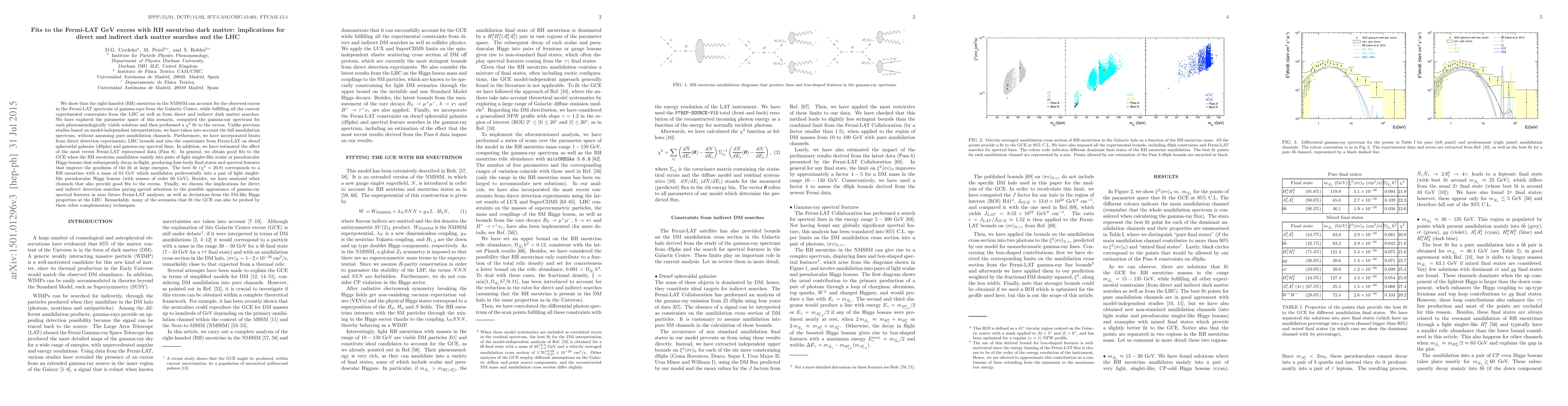 This paper demonstrates that the right-handed sneutrino in the NMSSM can explain the Fermi-LAT GeV gamma-ray excess from the Galactic Centre, while adhering to LHC, direct, and indirect dark matter constraints. The study finds good fits when the sneutrino annihilates into light singlet-like Higgs bosons, highlighting potential detection signatures for future Fermi-LAT and LHC experiments.